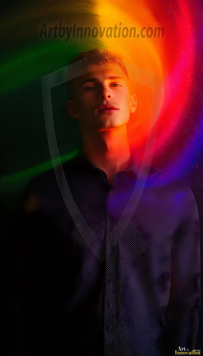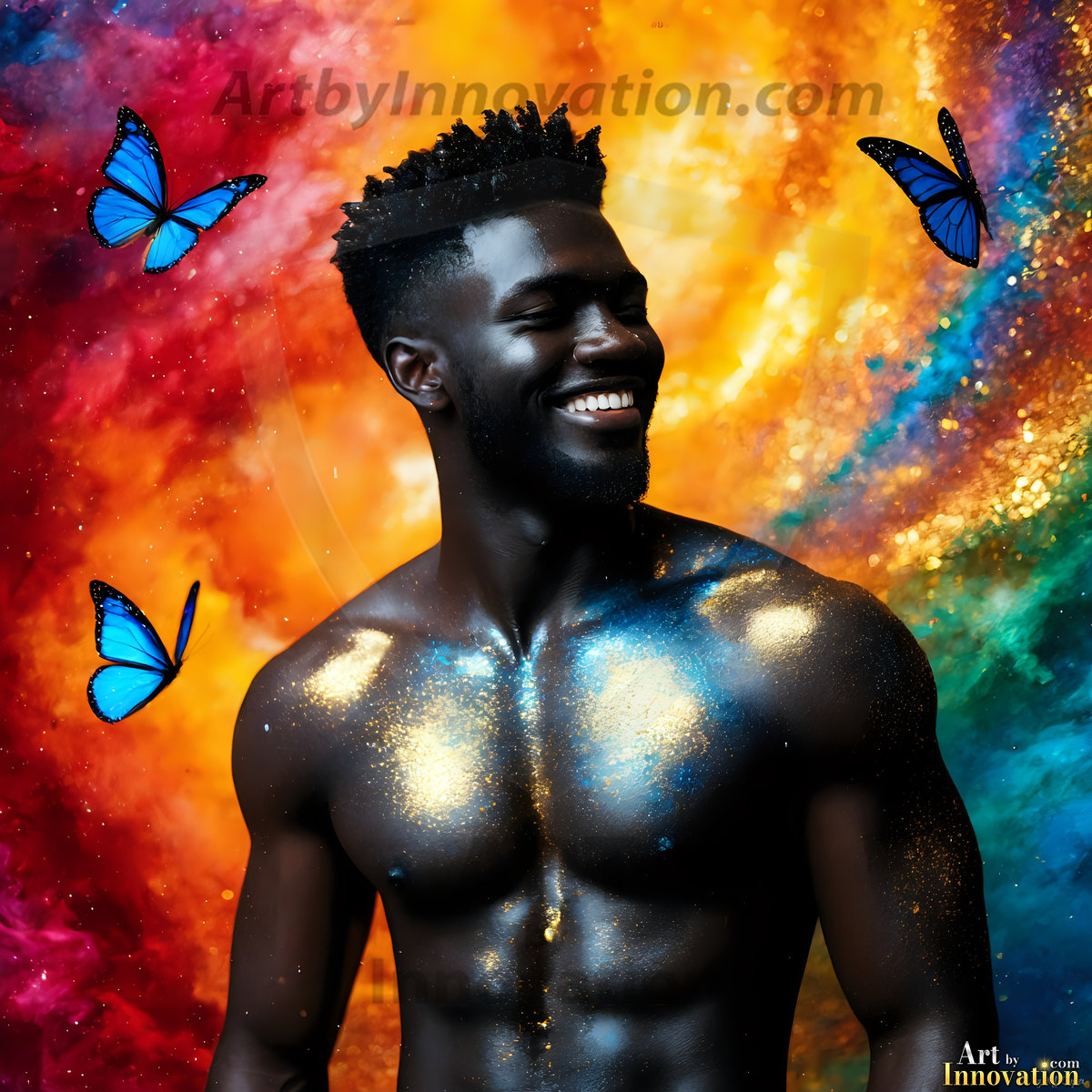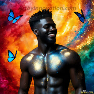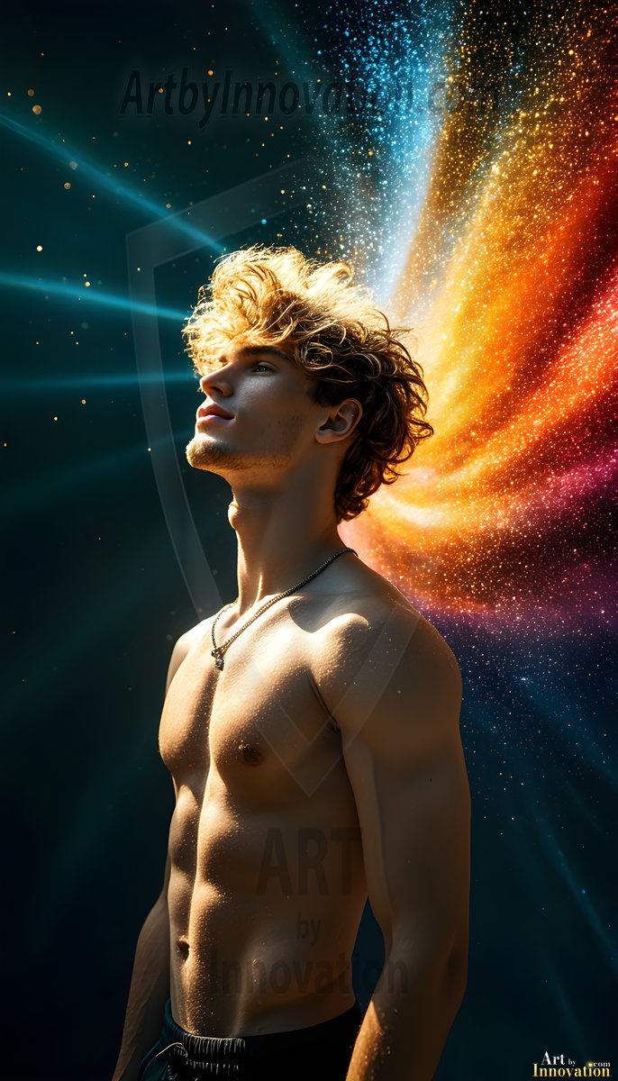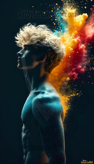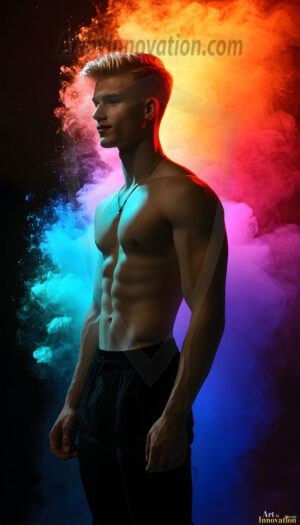 Beauty meets color in this stunning AI-generated abstract art collection. Handsome, shirtless men are enveloped from behind by vibrant, swirling translucent mists of color — inspired by the full spectrum of the rainbow, and the joyful palette of Pride. Each image combines photorealistic skin texture with surreal abstract color dynamics, creating a visual experience that is both deeply human and otherworldly. Created using Flux.1, ComfyUI, and Stable Diffusion by © Jeff Dupler | Art by Innovation | https://www.artbyinnovation.com