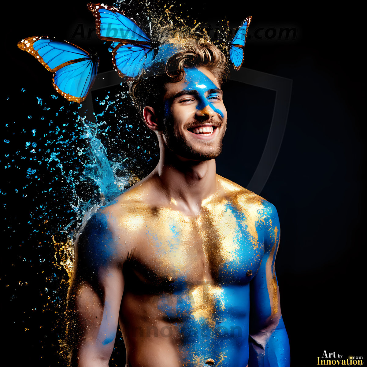 ByjeffAI-generated abstract art — hot handsome men covered in colorful body paint explosions, full of joy and rainbow color.