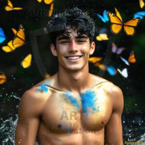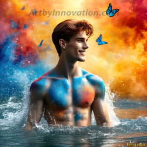 Beauty meets color in this stunning AI-generated abstract art collection. Handsome, shirtless men are enveloped from behind by vibrant, swirling translucent mists of color — inspired by the full spectrum of the rainbow, and the joyful palette of Pride. Each image combines photorealistic skin texture with surreal abstract color dynamics, creating a visual experience that is both deeply human and otherworldly. Created using Flux.1, ComfyUI, and Stable Diffusion by © Jeff Dupler | Art by Innovation | https://www.artbyinnovation.com