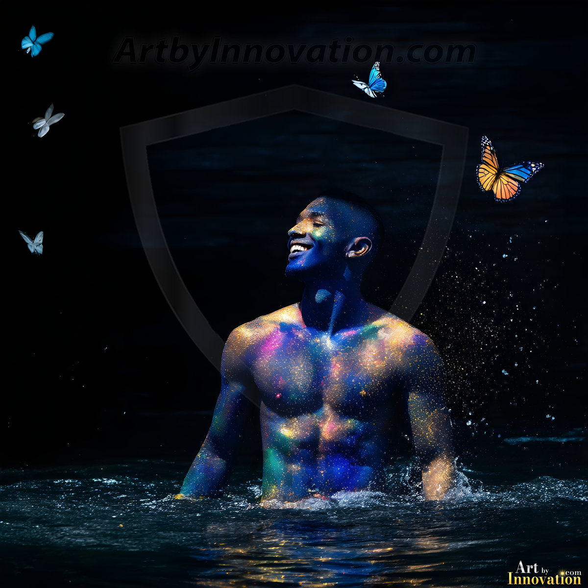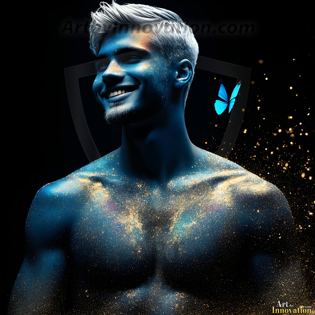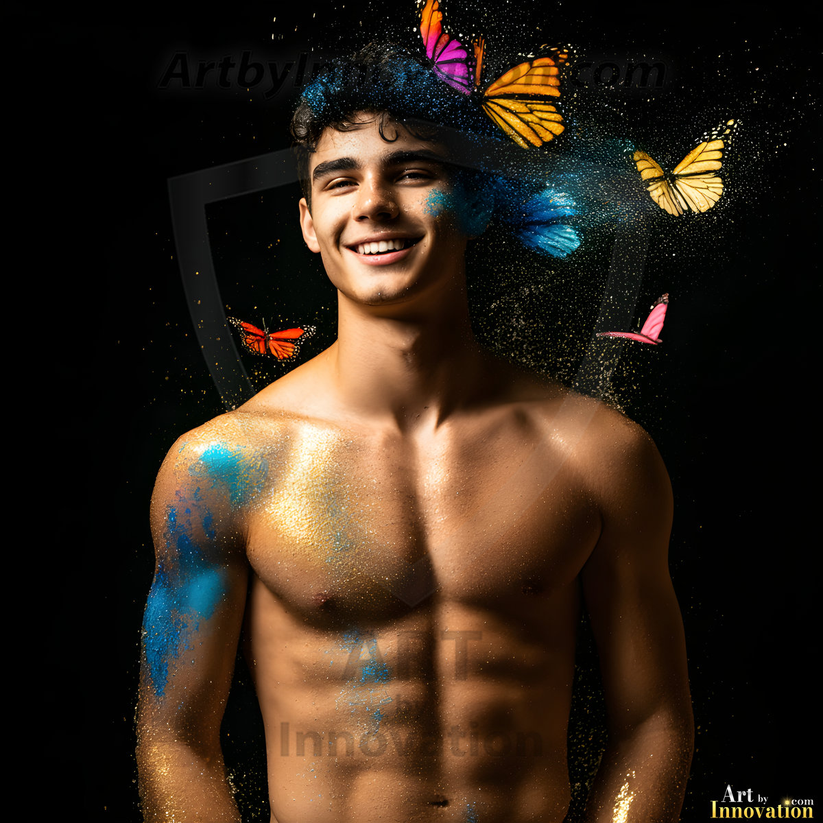 Beauty meets color in this stunning AI-generated abstract art collection. Handsome, shirtless men are enveloped from behind by vibrant, swirling translucent mists of color — inspired by the full spectrum of the rainbow, and the joyful palette of Pride. Each image combines photorealistic skin texture with surreal abstract color dynamics, creating a visual experience that is both deeply human and otherworldly. Created using Flux.1, ComfyUI, and Stable Diffusion by © Jeff Dupler | Art by Innovation | https://www.artbyinnovation.com