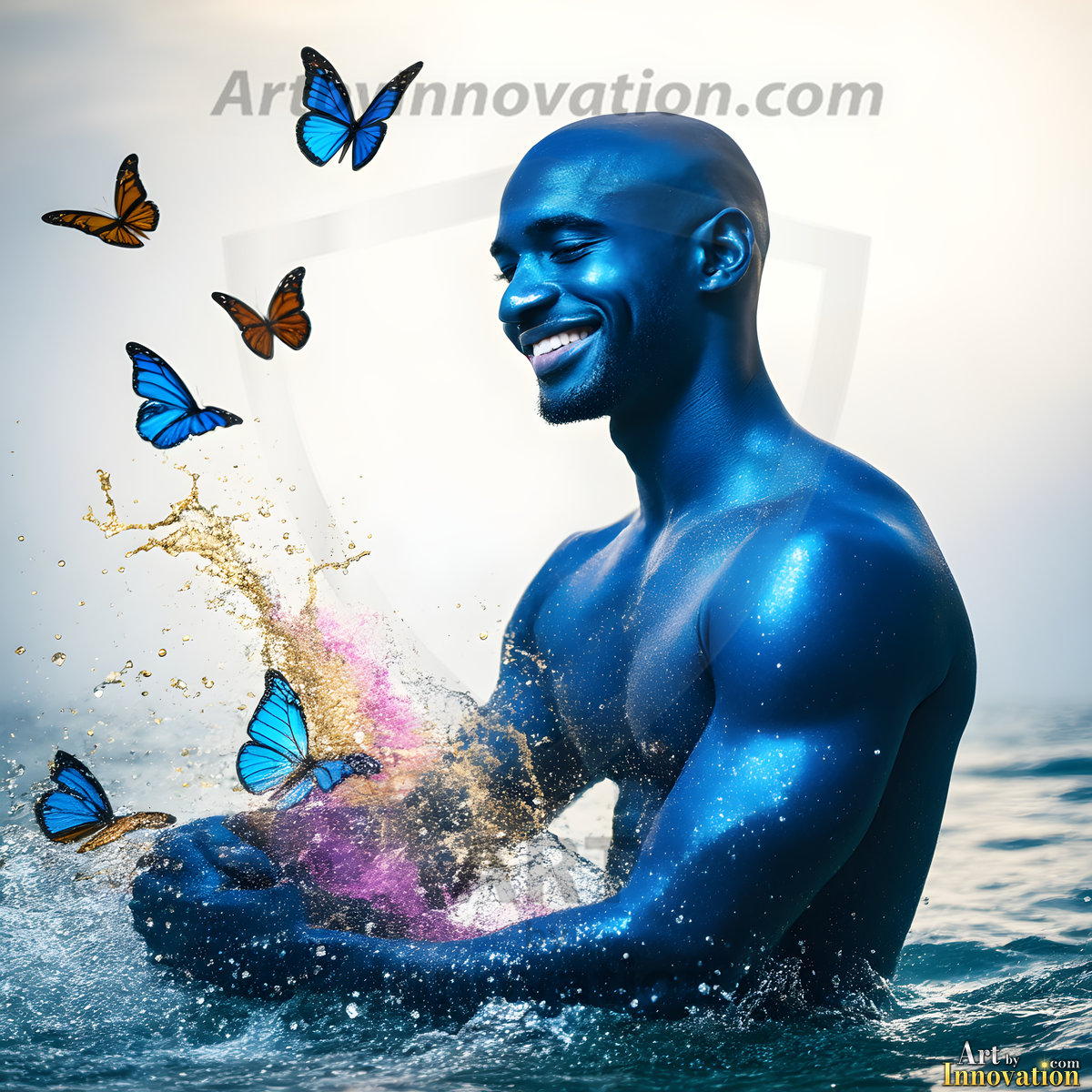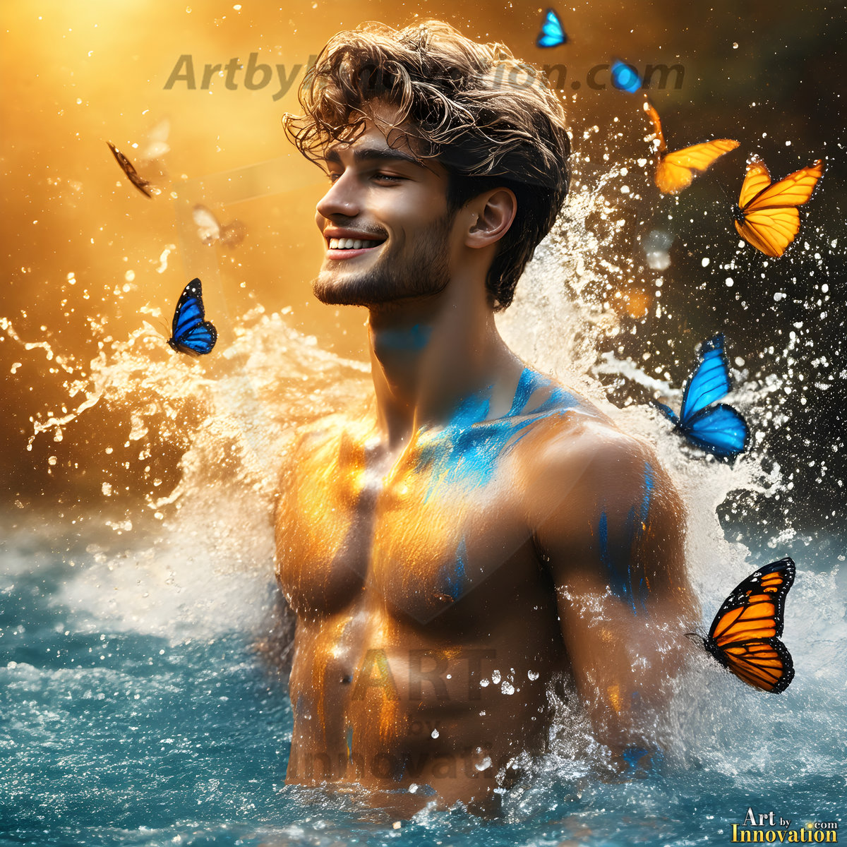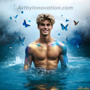 Beauty meets color in this stunning AI-generated abstract art collection. Handsome, shirtless men are enveloped from behind by vibrant, swirling translucent mists of color — inspired by the full spectrum of the rainbow, and the joyful palette of Pride. Each image combines photorealistic skin texture with surreal abstract color dynamics, creating a visual experience that is both deeply human and otherworldly. Created using Flux.1, ComfyUI, and Stable Diffusion by © Jeff Dupler | Art by Innovation | https://www.artbyinnovation.com