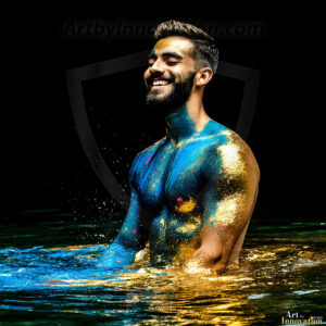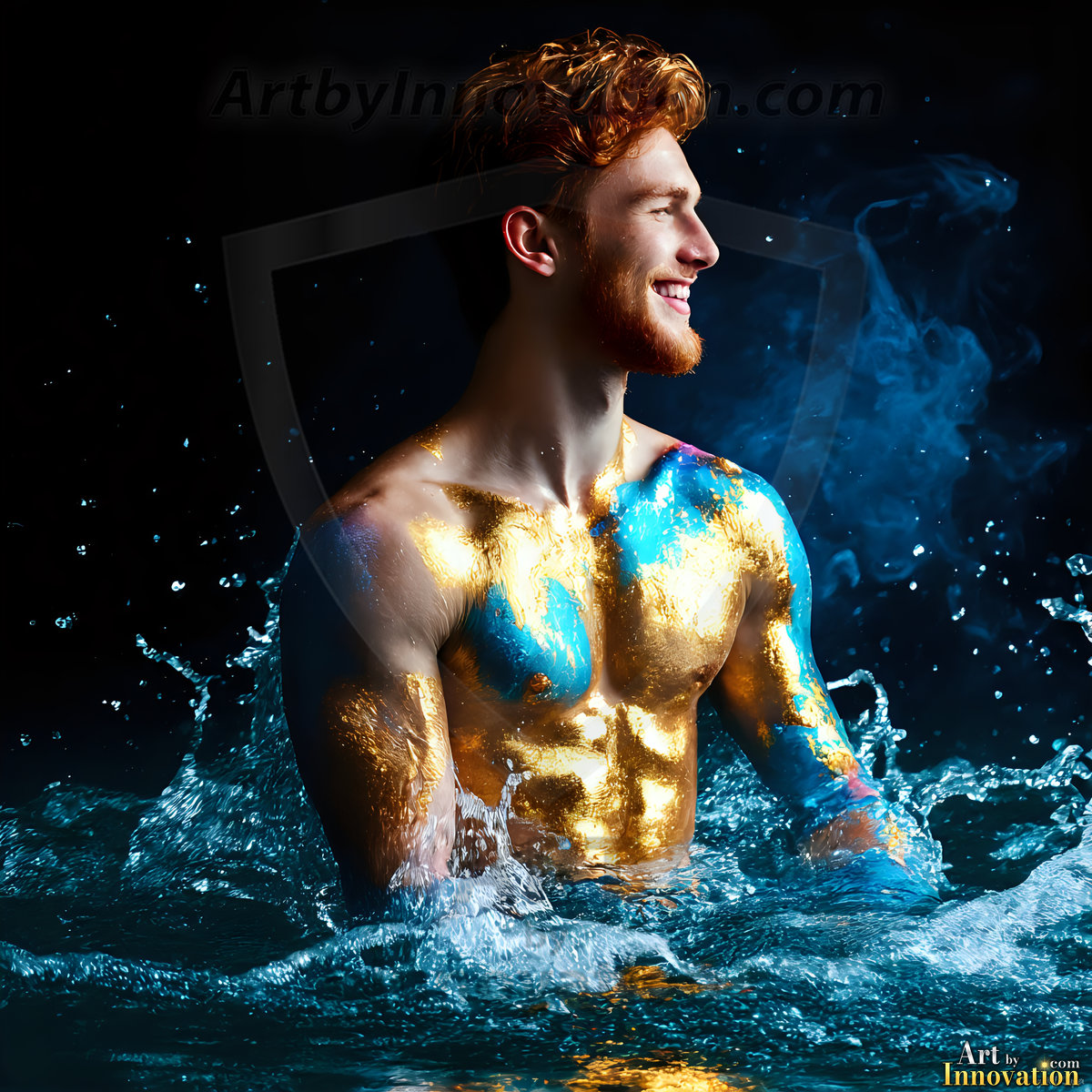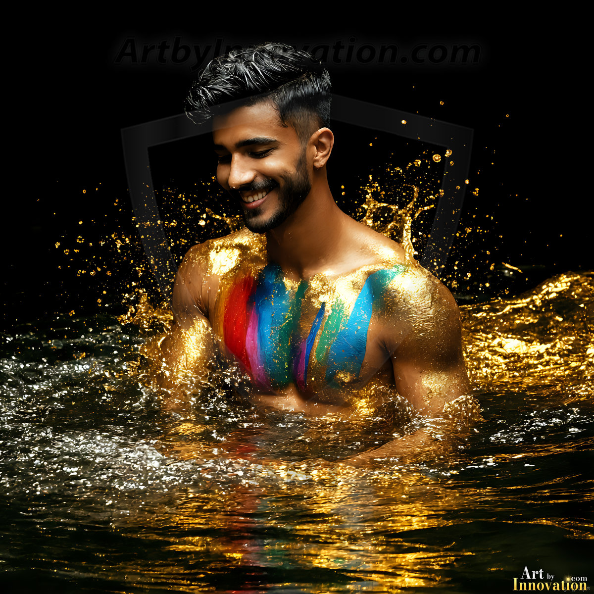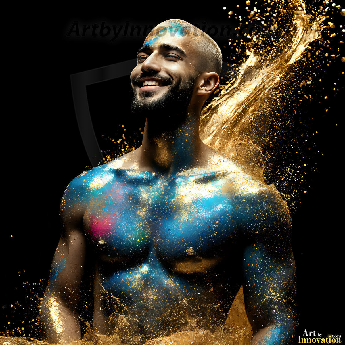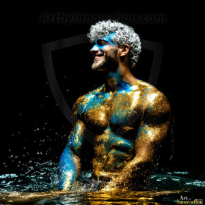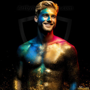Beauty meets color in this stunning AI-generated abstract art collection. Handsome, shirtless men are enveloped from behind by vibrant, swirling translucent mists of color — inspired by the full spectrum of the rainbow, and the joyful palette of Pride. Each image combines photorealistic skin texture with surreal abstract color dynamics, creating a visual experience that is both deeply human and otherworldly. Created using Flux.1, ComfyUI, and Stable Diffusion by © Jeff Dupler | Art by Innovation | https://www.artbyinnovation.com