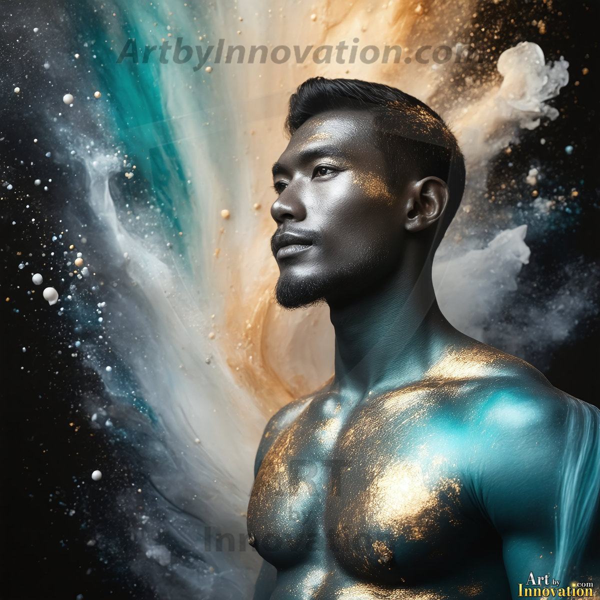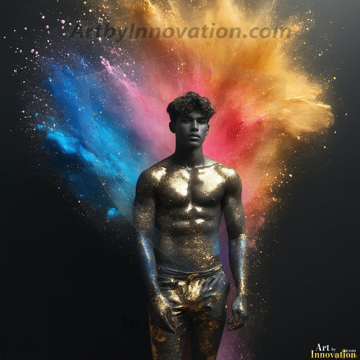 Beauty meets color in this stunning AI-generated abstract art collection. Handsome, shirtless men are enveloped from behind by vibrant, swirling translucent mists of color — inspired by the full spectrum of the rainbow, and the joyful palette of Pride. Each image combines photorealistic skin texture with surreal abstract color dynamics, creating a visual experience that is both deeply human and otherworldly. Created using Flux.1, ComfyUI, and Stable Diffusion by © Jeff Dupler | Art by Innovation | https://www.artbyinnovation.com
