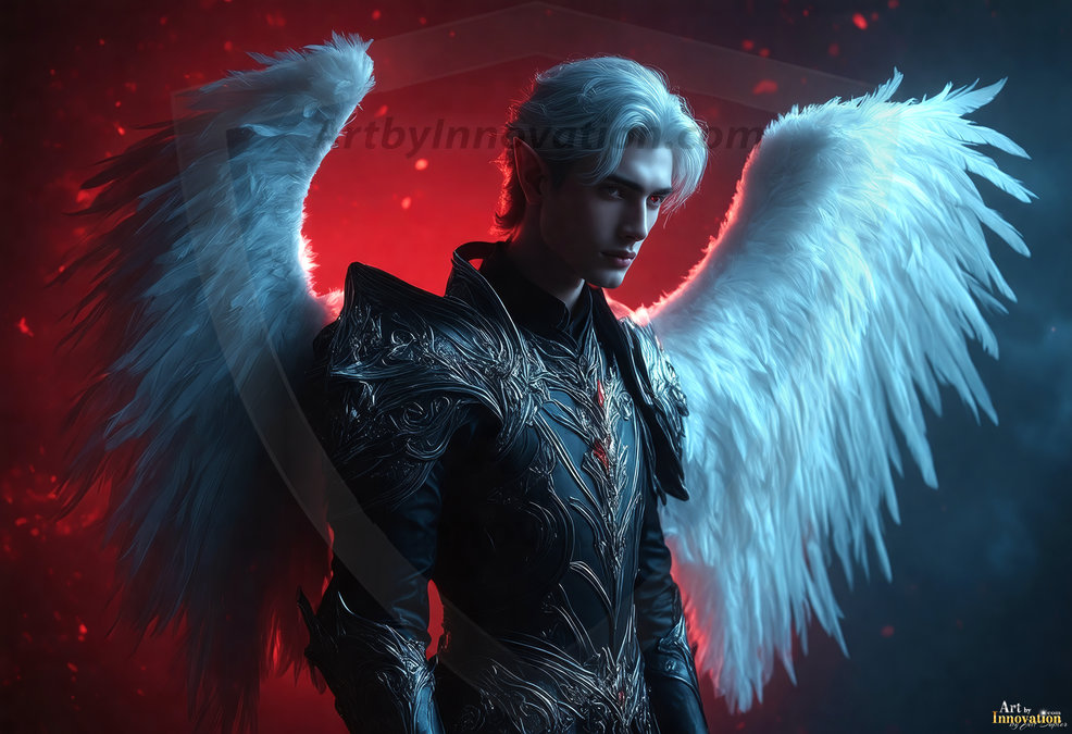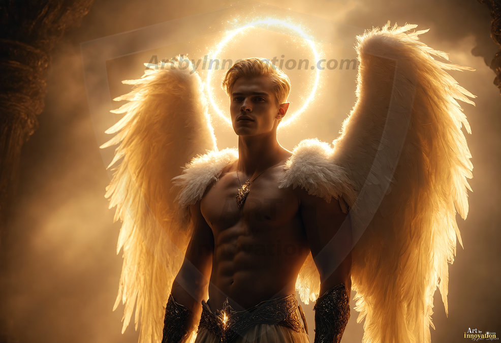 Heaven's Warriors descend. This AI-generated collection features stunningly handsome male angels with enormous, shimmering feathered wings — raw, untamed divine energy radiating from their chiseled forms. Set against heavenly skies, golden celestial cities, and ethereal cloudscapes, each angel exudes both breathtaking beauty and formidable divine power. Created using Flux.1 and ComfyUI by © Jeff Dupler | Art by Innovation | https://www.artbyinnovation.com