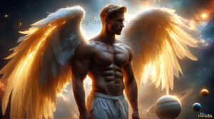 ByjeffAI-generated art of handsome celestial spirits living on the outskirts of a majestic golden heavenly city — gothic architecture and galactic skies.