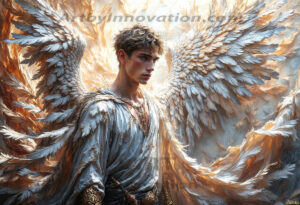 ByjeffHandsome AI-generated male warrior angels in divine holy armor with vibrant wings — God’s warriors in the golden city of heaven.
