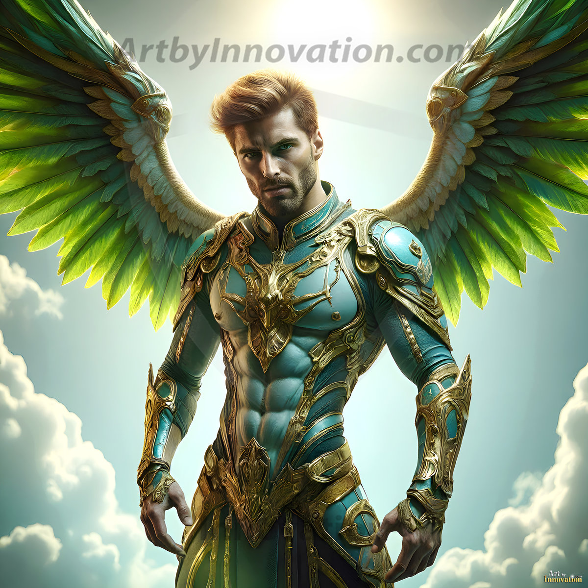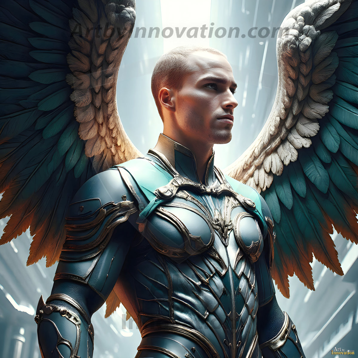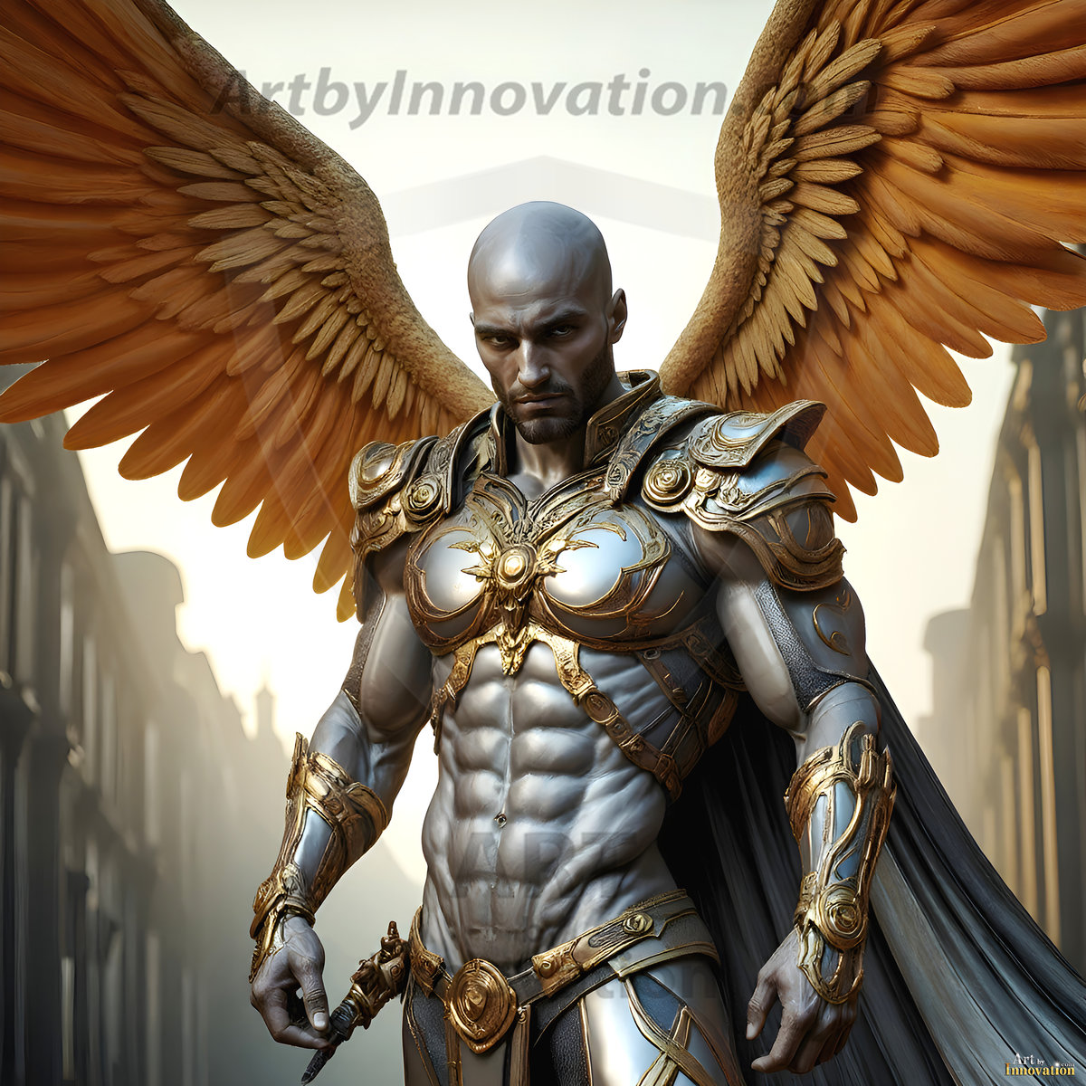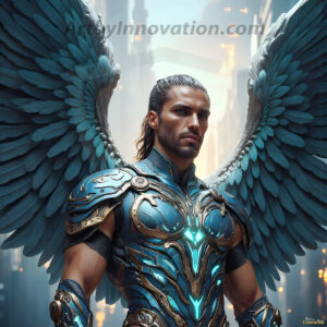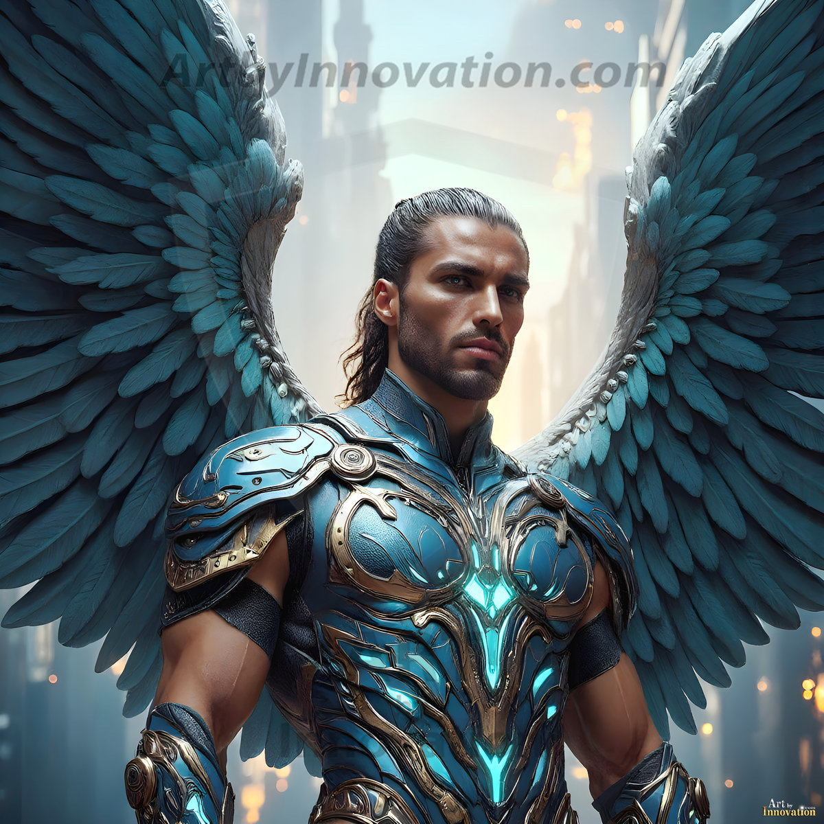 God's warriors stand ready. This AI-generated collection features handsome male warrior angels in elegant divine armor with vibrant holy wings — possessing grand feathered wings that look like swords, ready to battle on God's command. Set in a breathtaking golden city in the heavens, with ornate gold buildings, majestic architecture, ethereal cityscapes, and mystical waterfalls. Men of all ages, races, and body types represented. Created using Flux.1 and ComfyUI by © Jeff Dupler | Art by Innovation | https://www.artbyinnovation.com