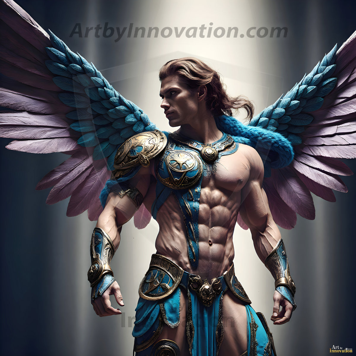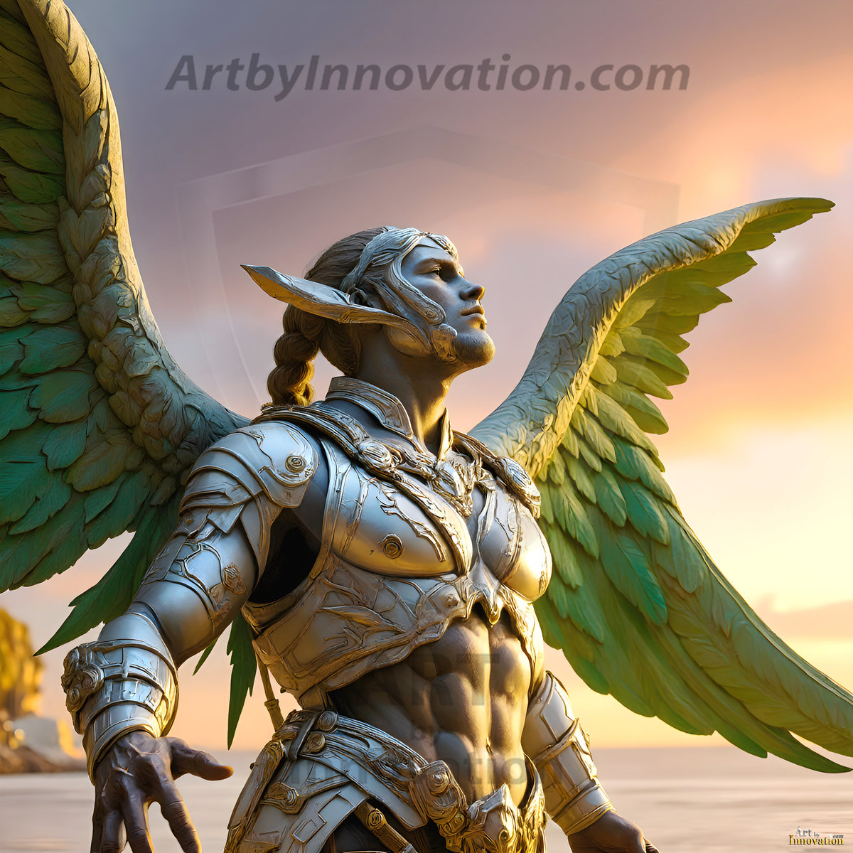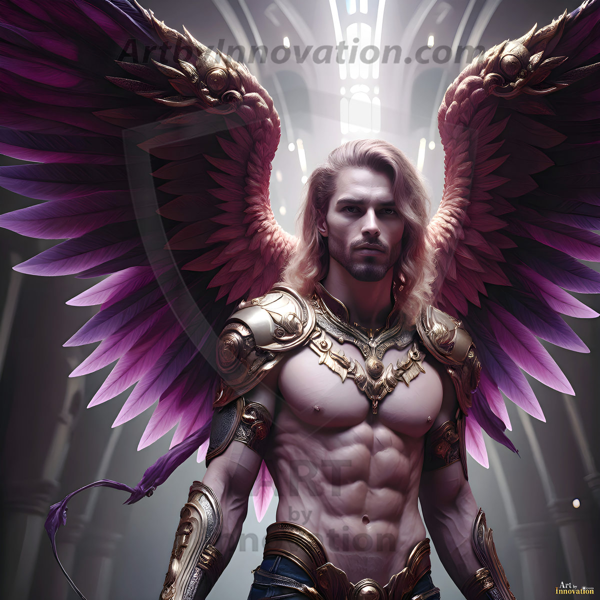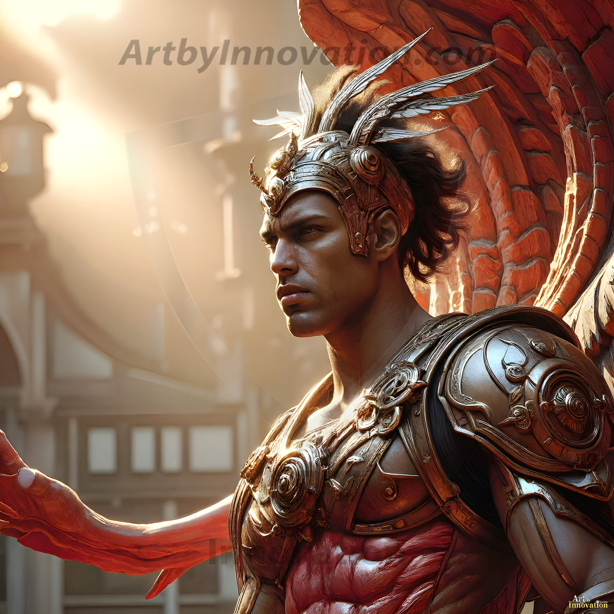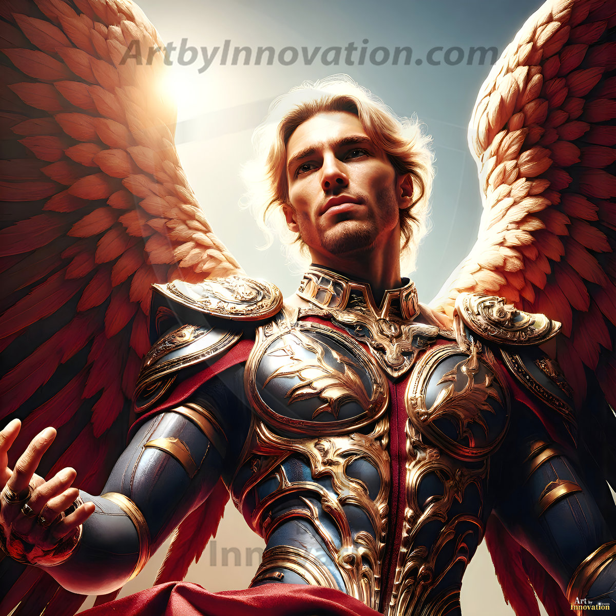 God's warriors stand ready. This AI-generated collection features handsome male warrior angels in elegant divine armor with vibrant holy wings — possessing grand feathered wings that look like swords, ready to battle on God's command. Set in a breathtaking golden city in the heavens, with ornate gold buildings, majestic architecture, ethereal cityscapes, and mystical waterfalls. Men of all ages, races, and body types represented. Created using Flux.1 and ComfyUI by © Jeff Dupler | Art by Innovation | https://www.artbyinnovation.com