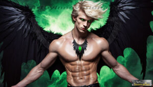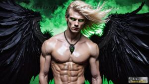 ByjeffAI-generated hot male demons with dark wings and glowing eyes — handsome, dangerous, and seductive from the ruins of hell.