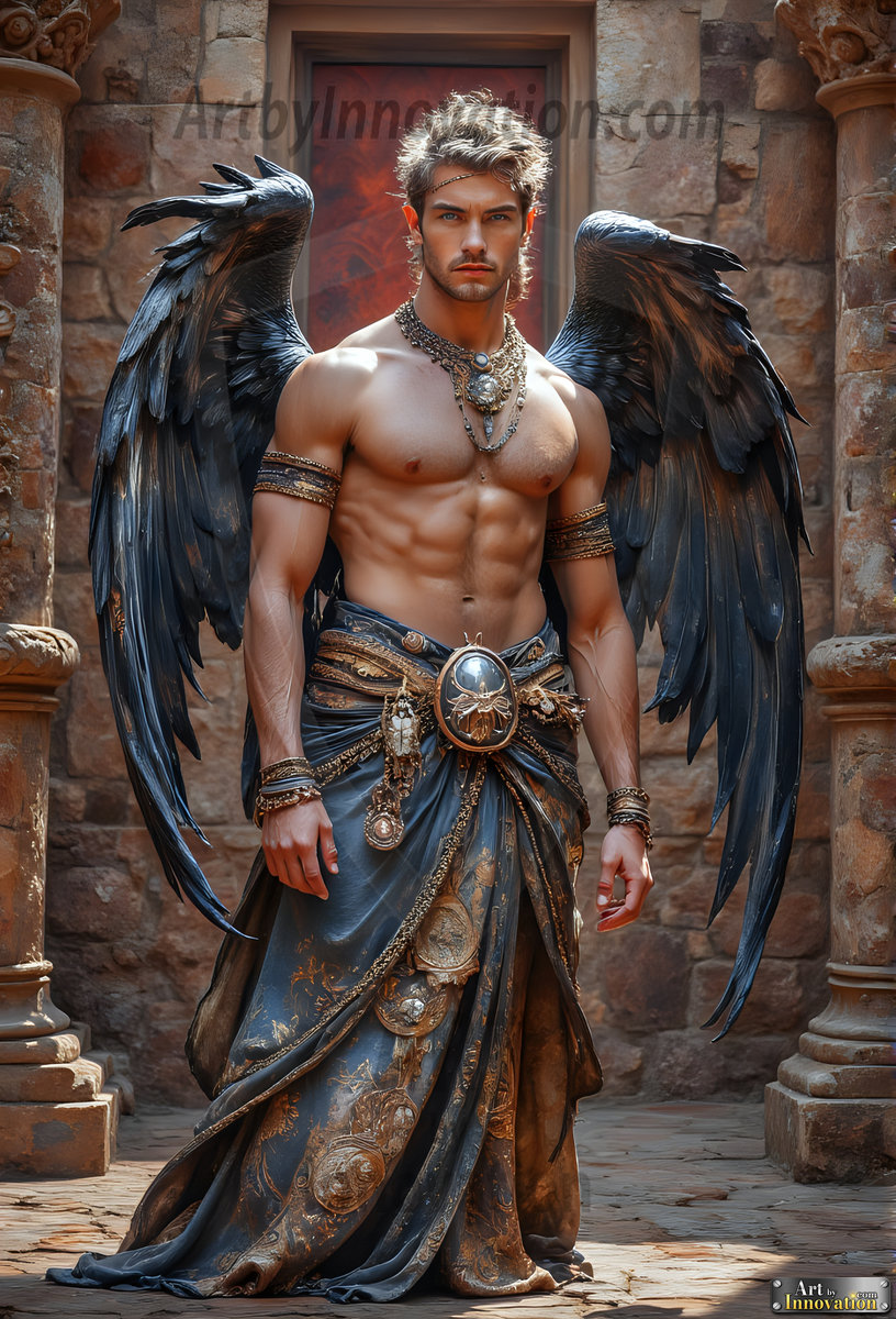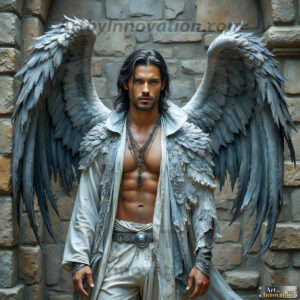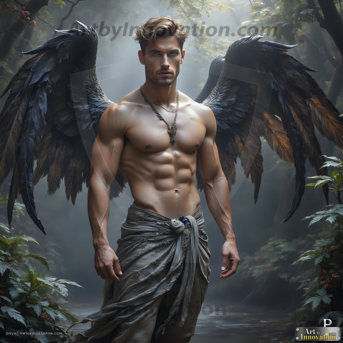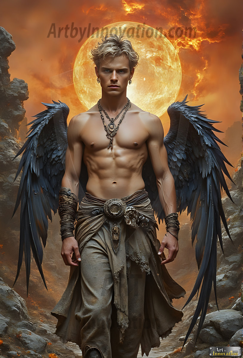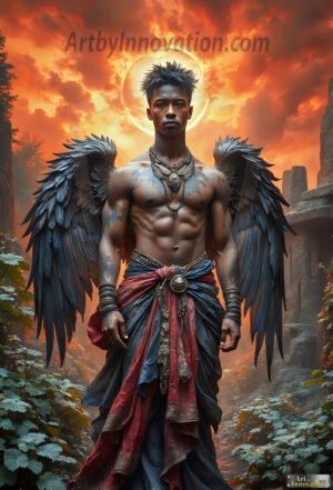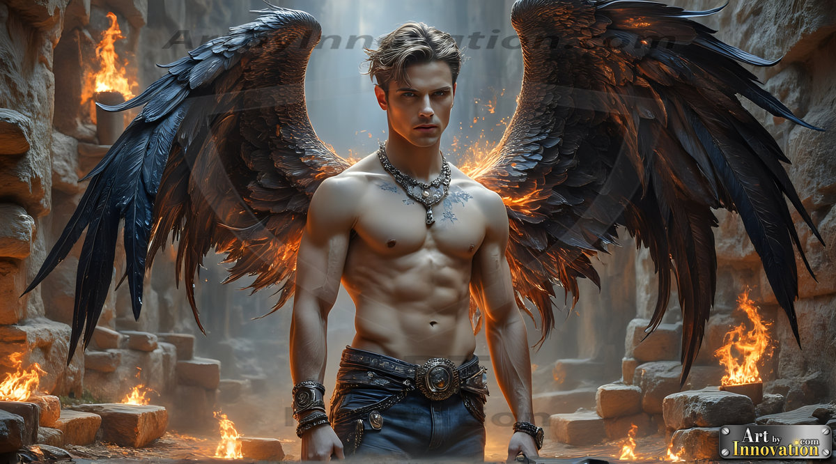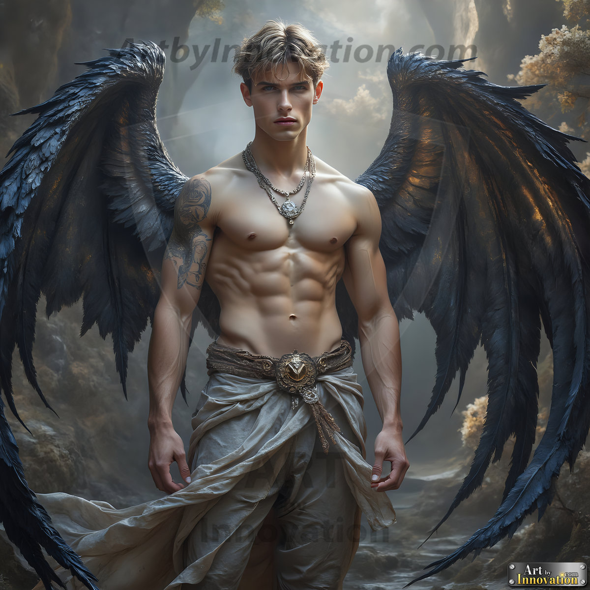 Fallen from grace — but never from beauty. This AI-generated dark angel collection features stunningly handsome fallen angels with massive black and silver feathered wings, set against gothic atmospheric backdrops of crumbling marble pillars, swirling crimson mists, and haunting desolate battlefields. Each image captures the raw, electrifying presence of a being between worlds — beautiful and terrifying in equal measure. Created using Flux.1 and ComfyUI by © Jeff Dupler | Art by Innovation | https://www.artbyinnovation.com
