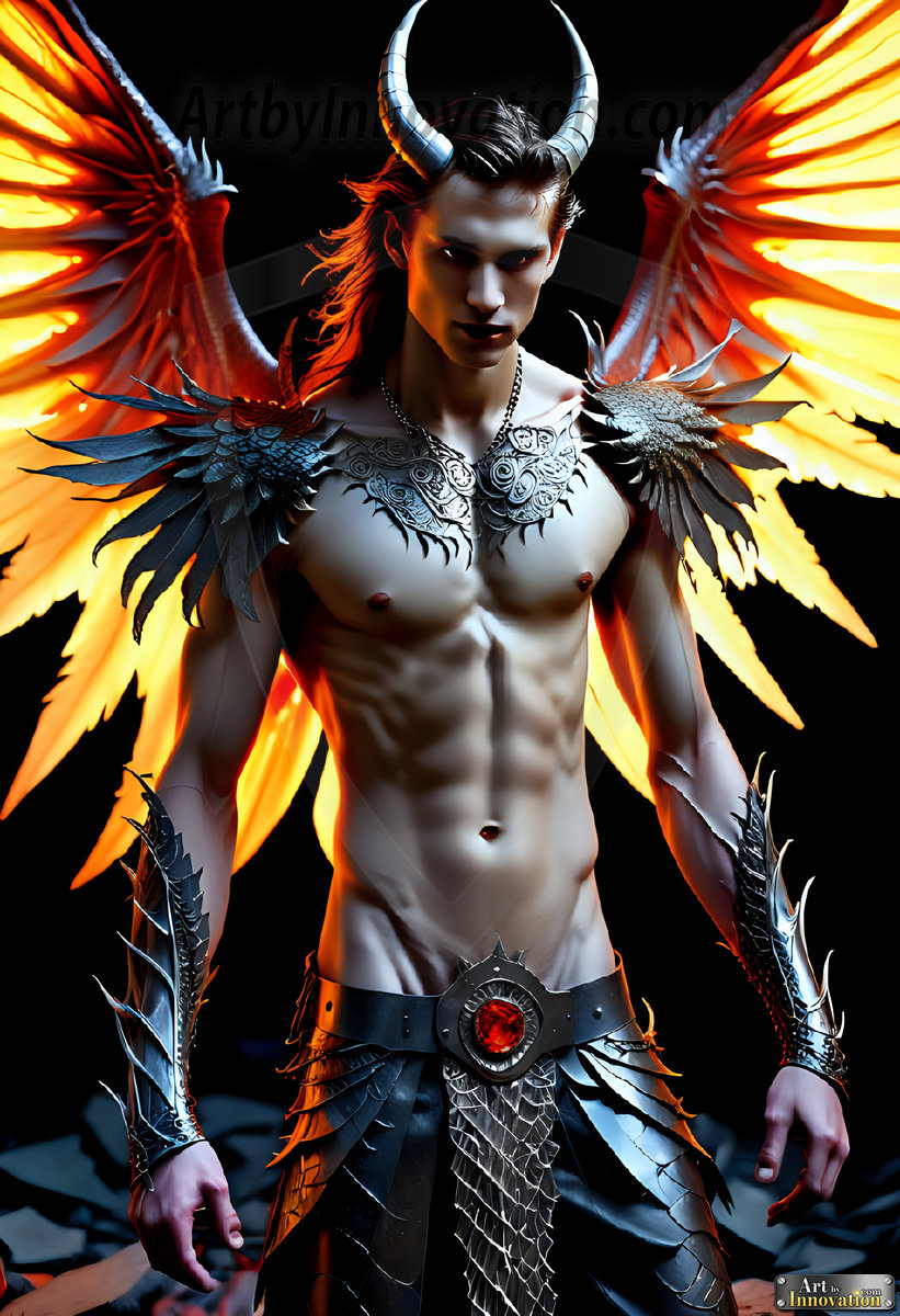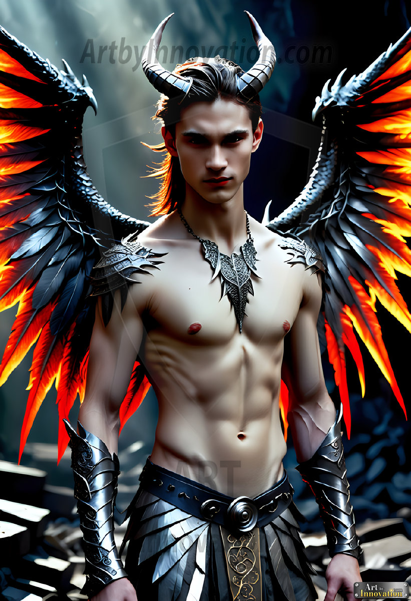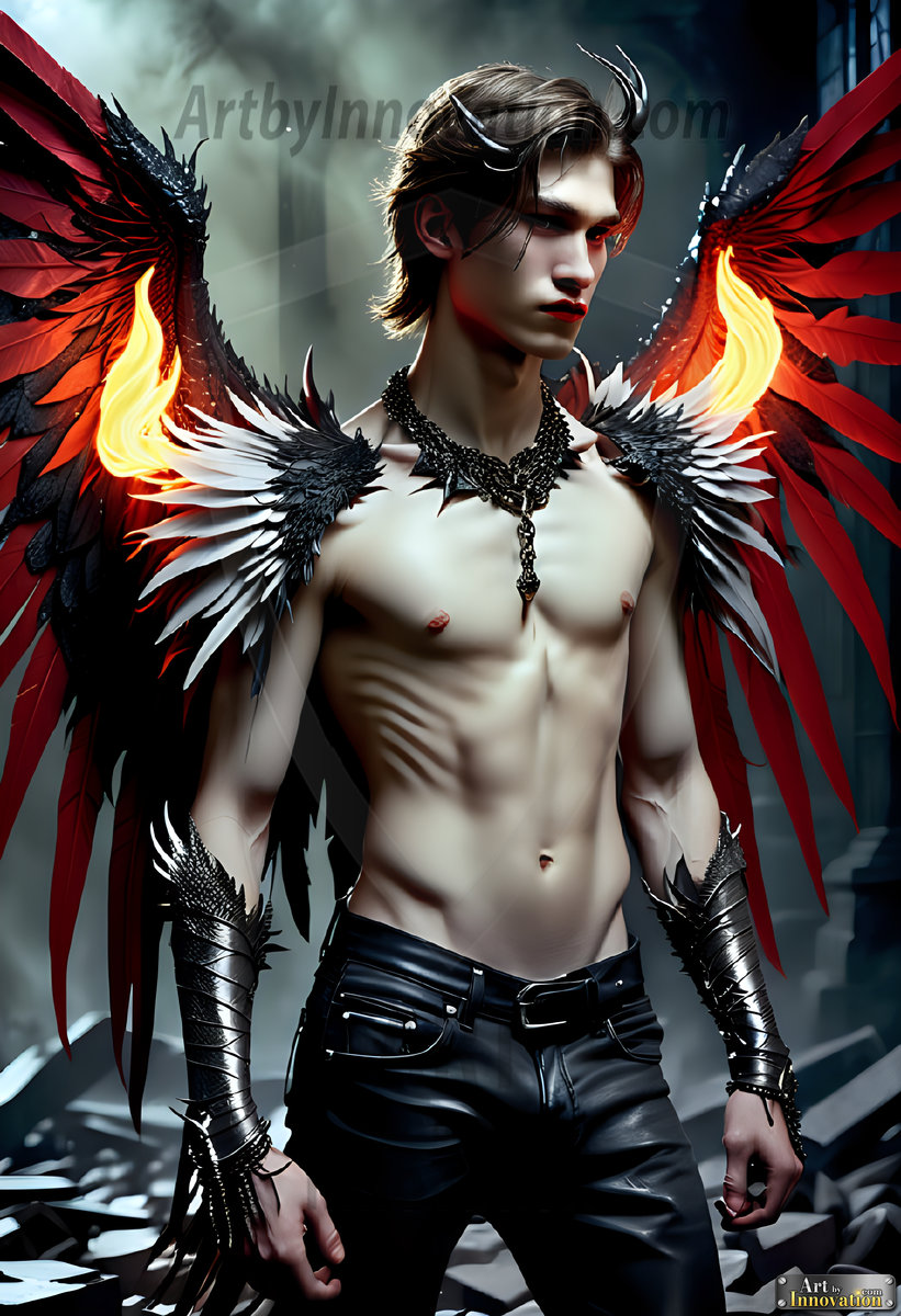 ByjeffAI-generated hot male demons with dark wings and glowing eyes — handsome, dangerous, and seductive from the ruins of hell.