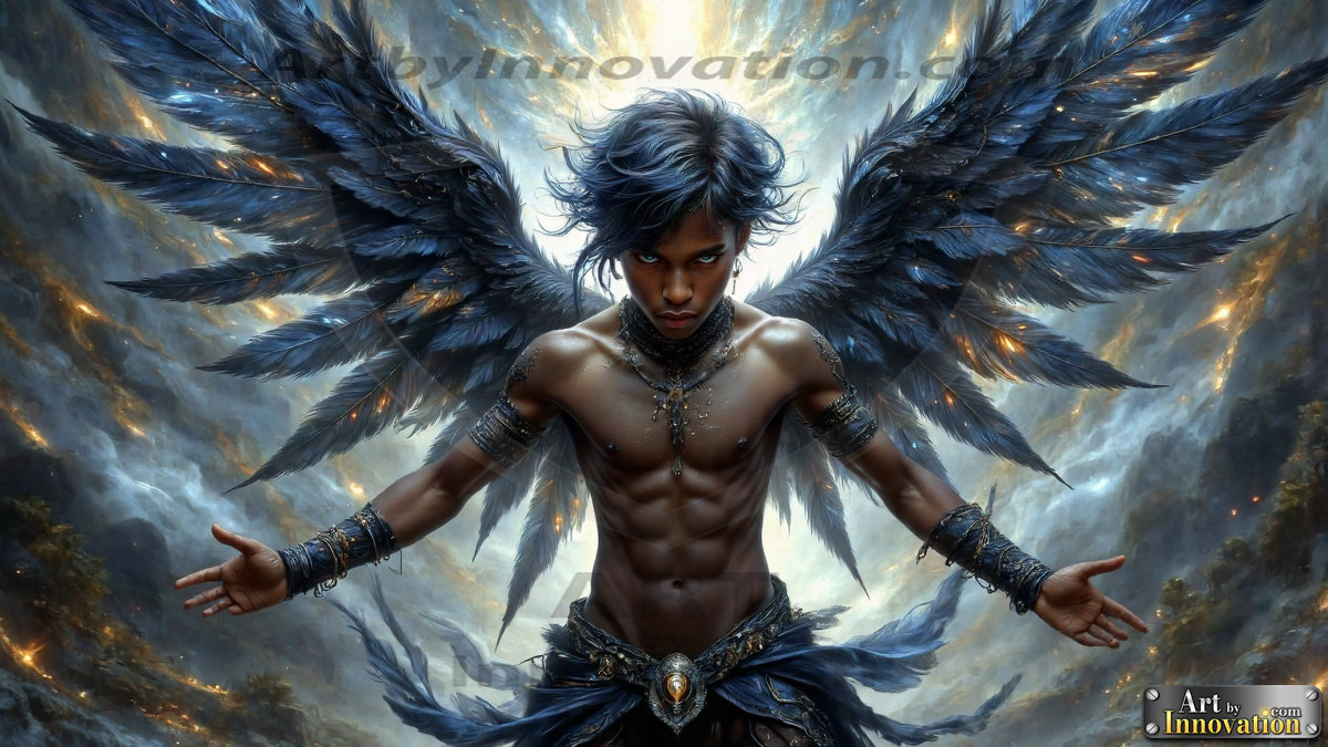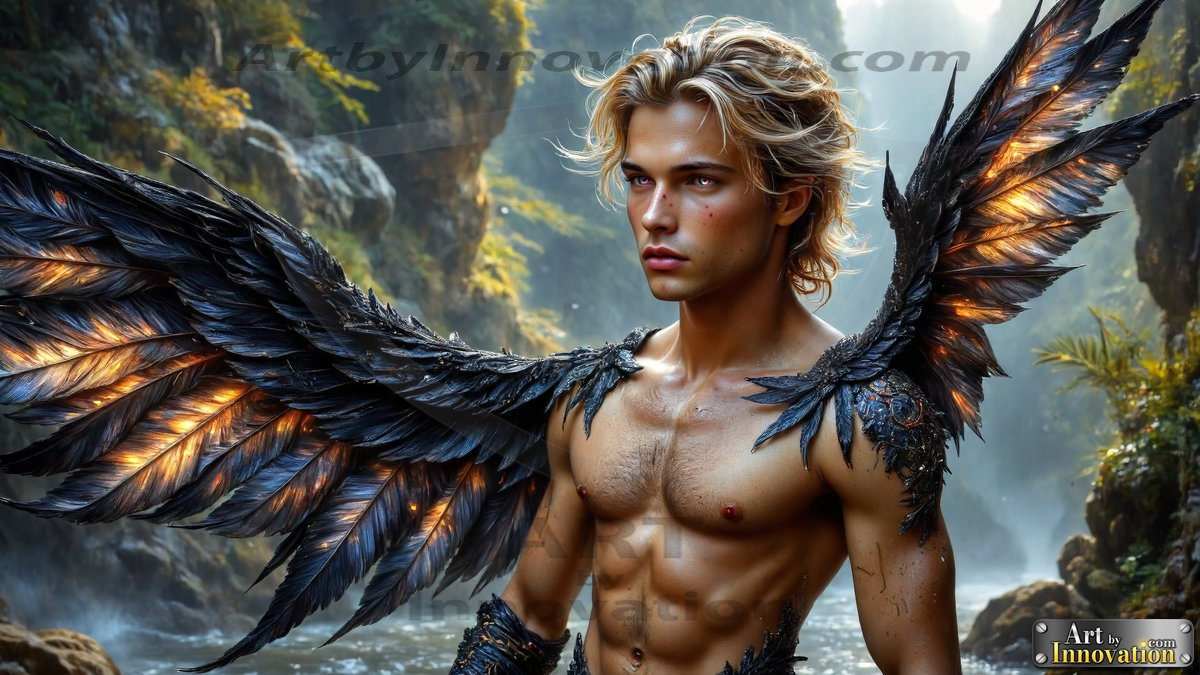 Fallen from grace — but never from beauty. This AI-generated dark angel collection features stunningly handsome fallen angels with massive black and silver feathered wings, set against gothic atmospheric backdrops of crumbling marble pillars, swirling crimson mists, and haunting desolate battlefields. Each image captures the raw, electrifying presence of a being between worlds — beautiful and terrifying in equal measure. Created using Flux.1 and ComfyUI by © Jeff Dupler | Art by Innovation | https://www.artbyinnovation.com