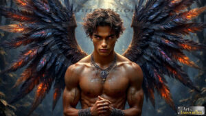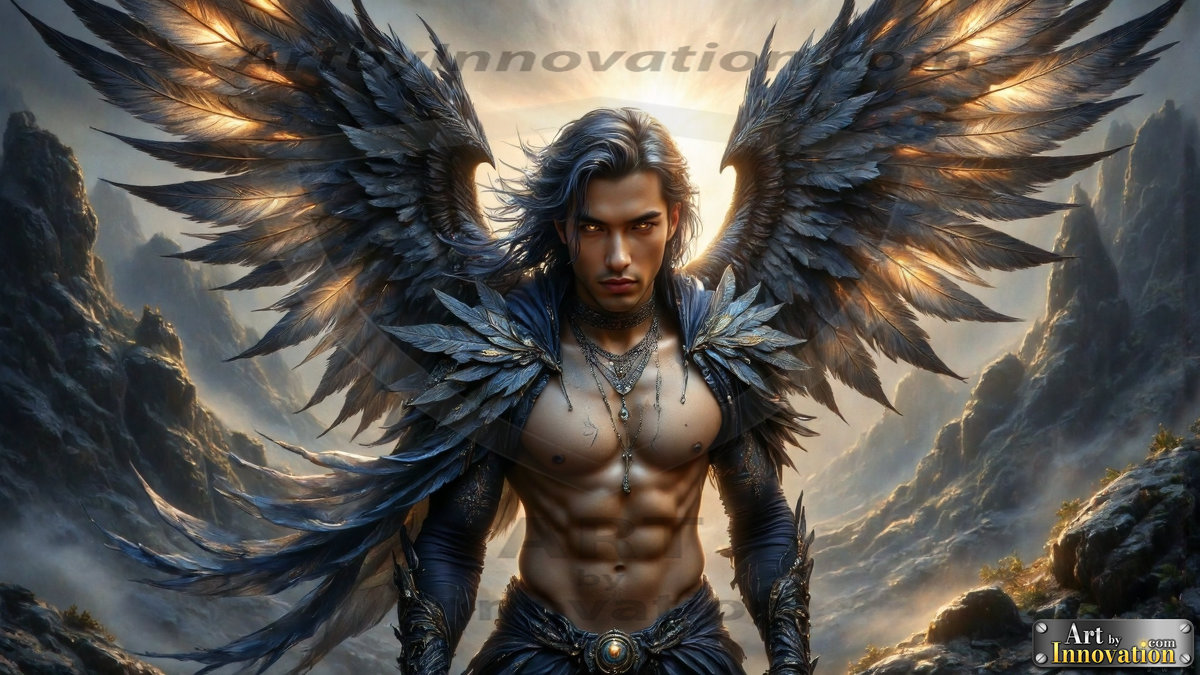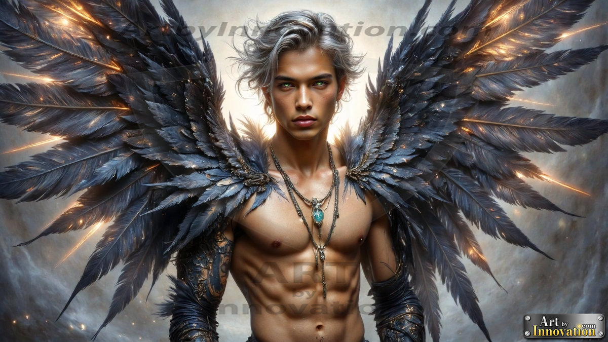 Fallen from grace — but never from beauty. This AI-generated dark angel collection features stunningly handsome fallen angels with massive black and silver feathered wings, set against gothic atmospheric backdrops of crumbling marble pillars, swirling crimson mists, and haunting desolate battlefields. Each image captures the raw, electrifying presence of a being between worlds — beautiful and terrifying in equal measure. Created using Flux.1 and ComfyUI by © Jeff Dupler | Art by Innovation | https://www.artbyinnovation.com