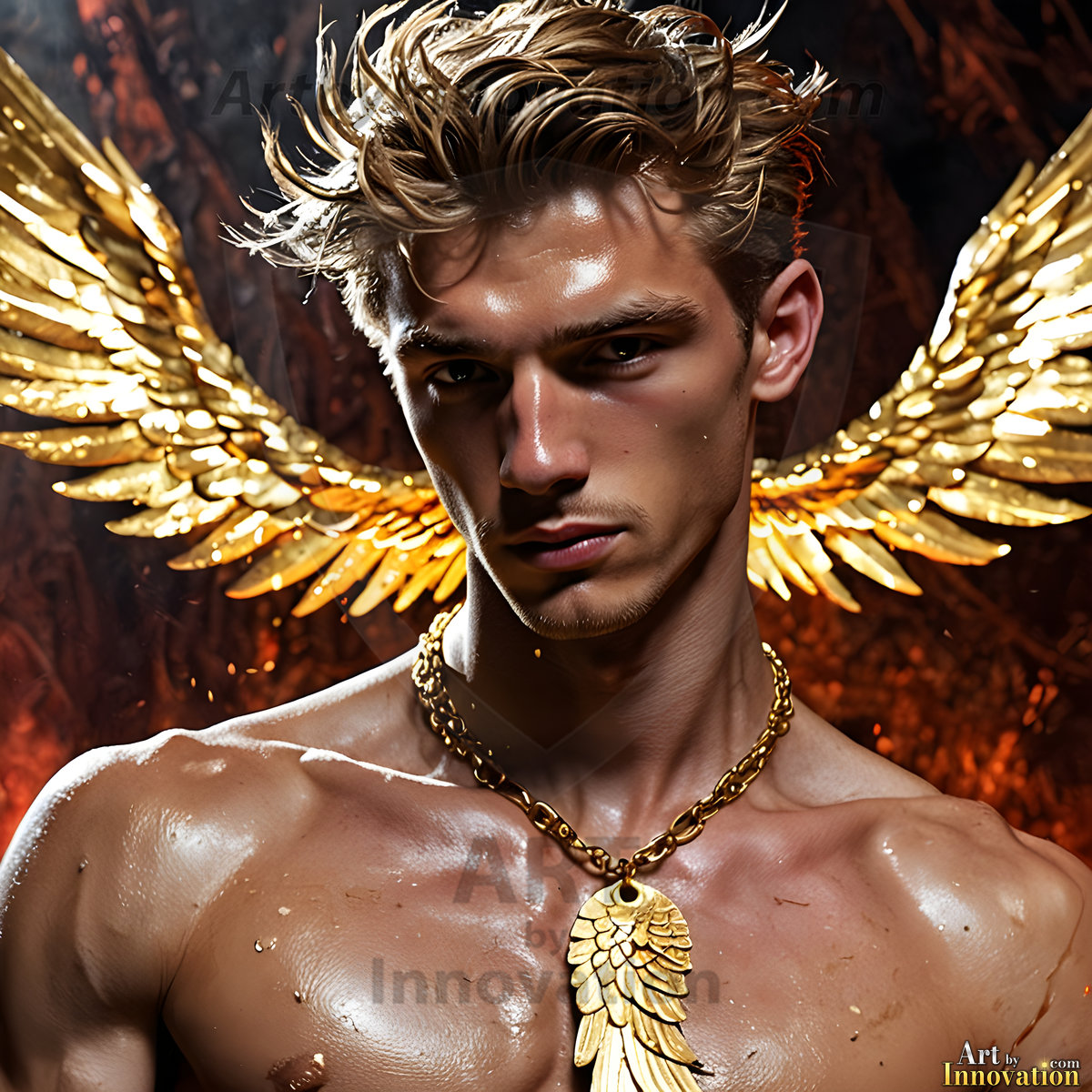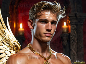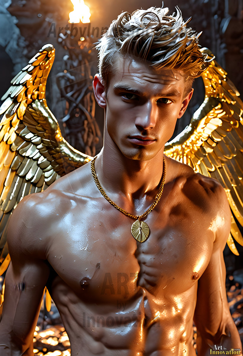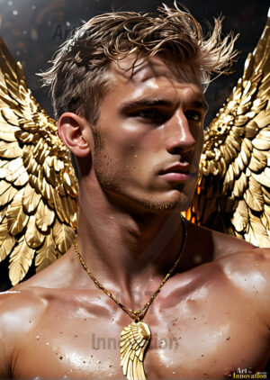 God's most radiant warriors. This AI-generated golden angel collection features stunningly handsome male angels with enormous golden feathered wings, bathed in golden radiant light rays and divine halo lighting. Set against backdrops ranging from chaotic battlefields to celestial heavenly realms, each golden angel radiates a divine beauty that is both commanding and breathtaking. Created using Flux.1 and ComfyUI by © Jeff Dupler | Art by Innovation | https://www.artbyinnovation.com