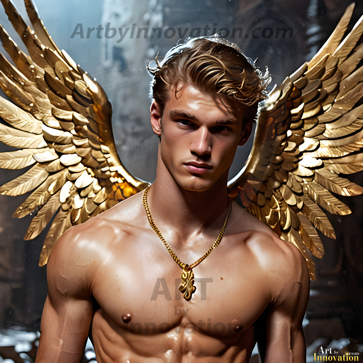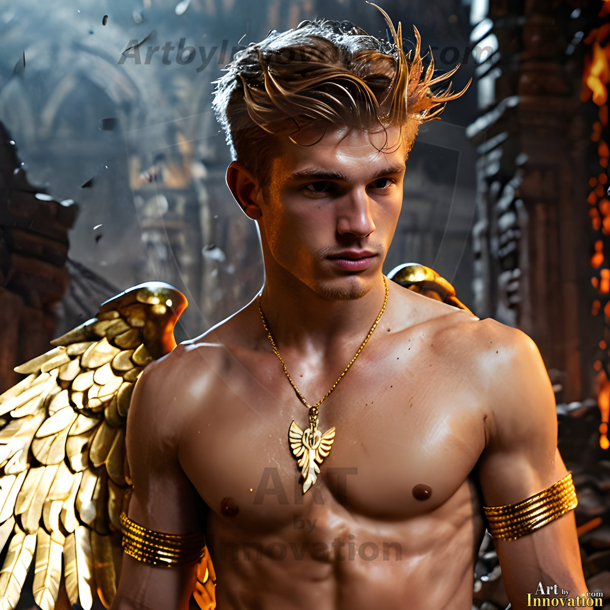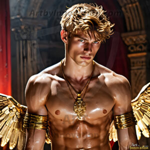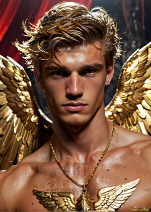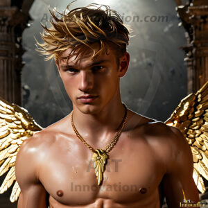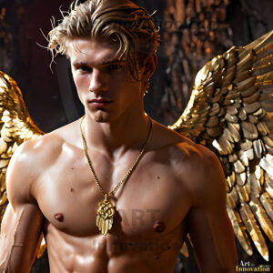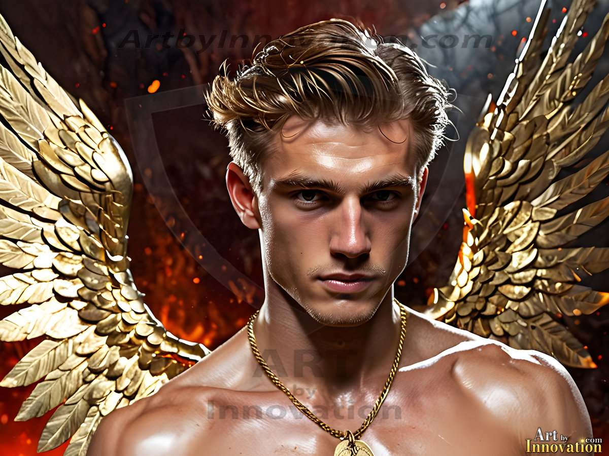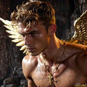 God's most radiant warriors. This AI-generated golden angel collection features stunningly handsome male angels with enormous golden feathered wings, bathed in golden radiant light rays and divine halo lighting. Set against backdrops ranging from chaotic battlefields to celestial heavenly realms, each golden angel radiates a divine beauty that is both commanding and breathtaking. Created using Flux.1 and ComfyUI by © Jeff Dupler | Art by Innovation | https://www.artbyinnovation.com