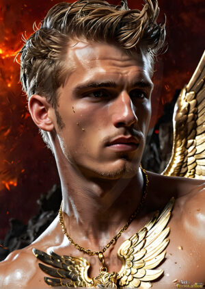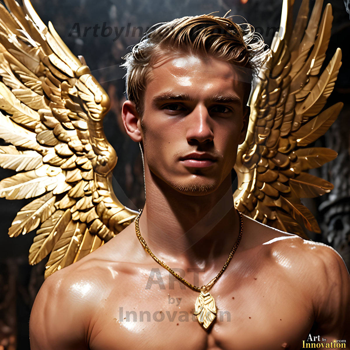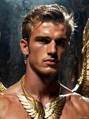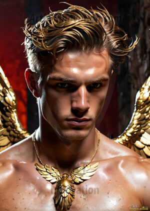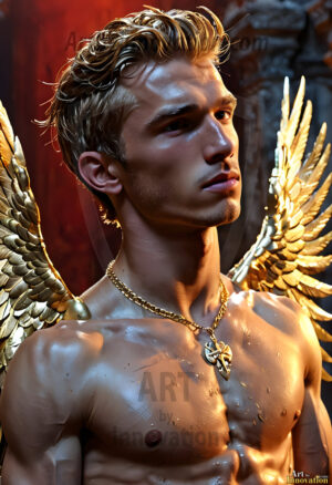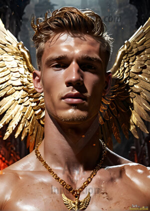ByjeffAI generated fantasy photos, of handsome male warrior angels, in divine armor with vibrant holy wings. Wearing ethereal or plate holy armor, and glistening golden gilded jewelry, emphasizing his god-like stature, vibrantly colored. Possessing grand feathered wings, that look like swords, these angel warriors are ready to battle on God’s command. With men of all ages, races, and body types. In a city of gold, spiritual wonder city in the heavens, with ornate gold buildings, majestic gold architecture, ethereal cityscapes, and mystical waterfalls.