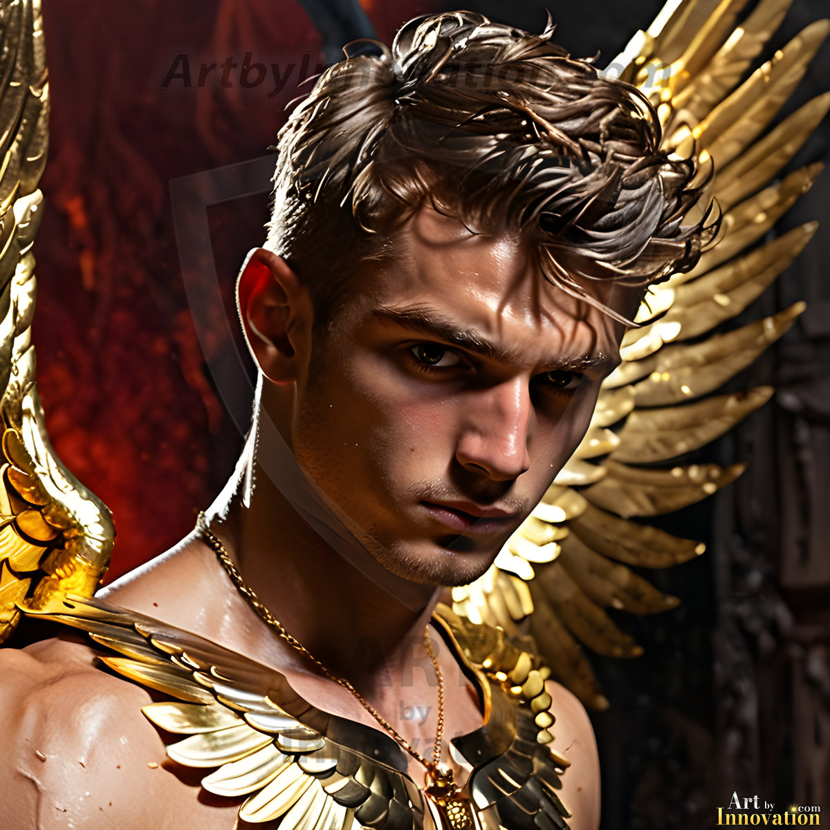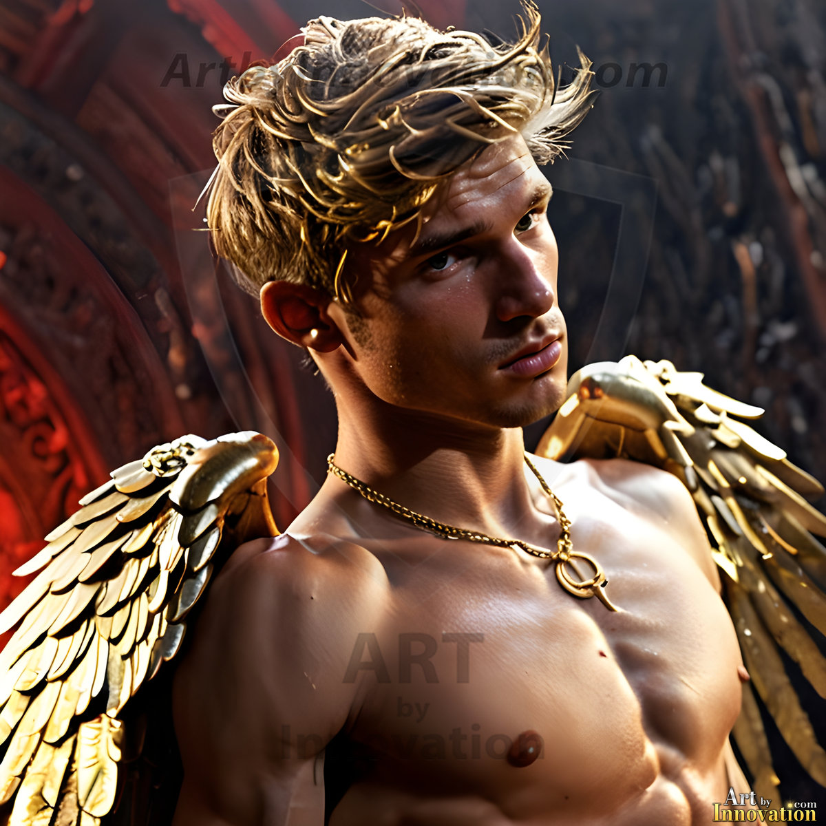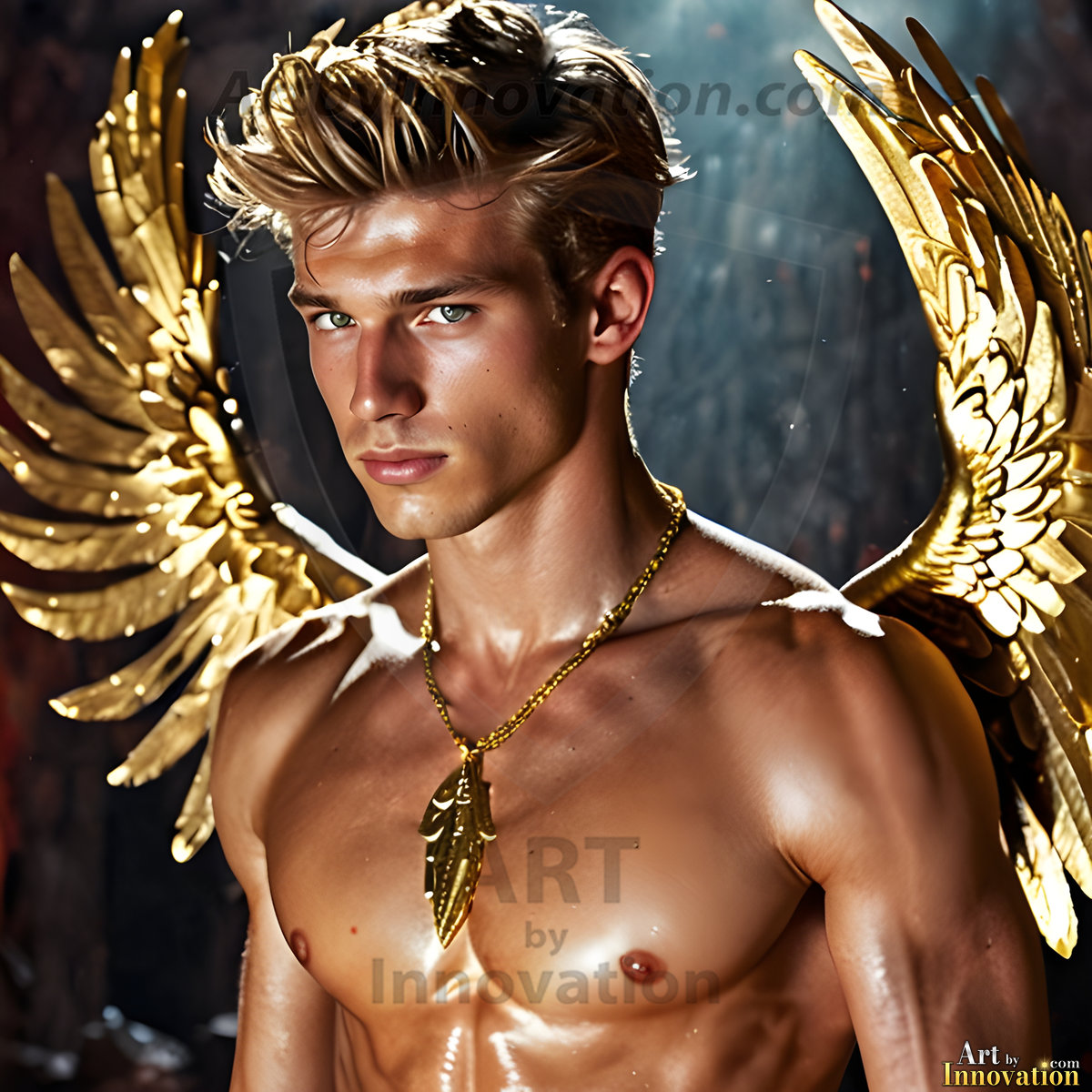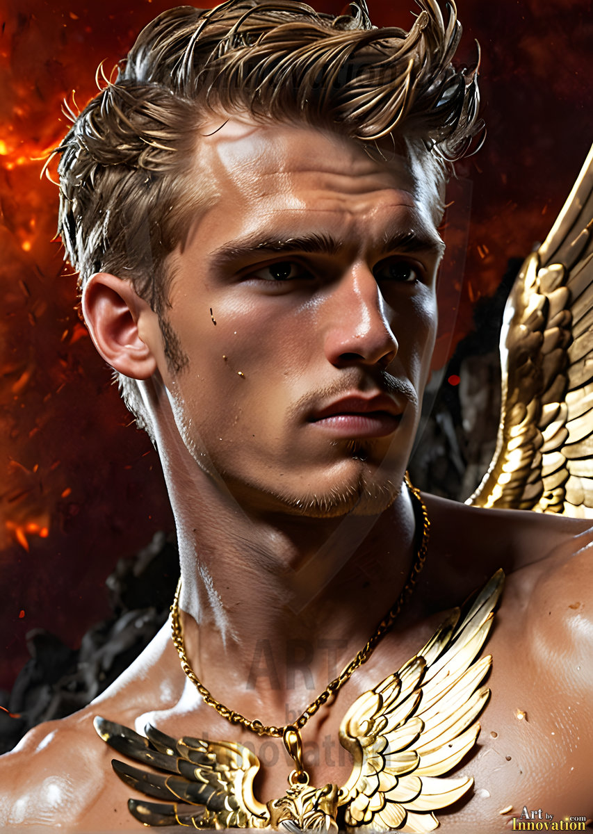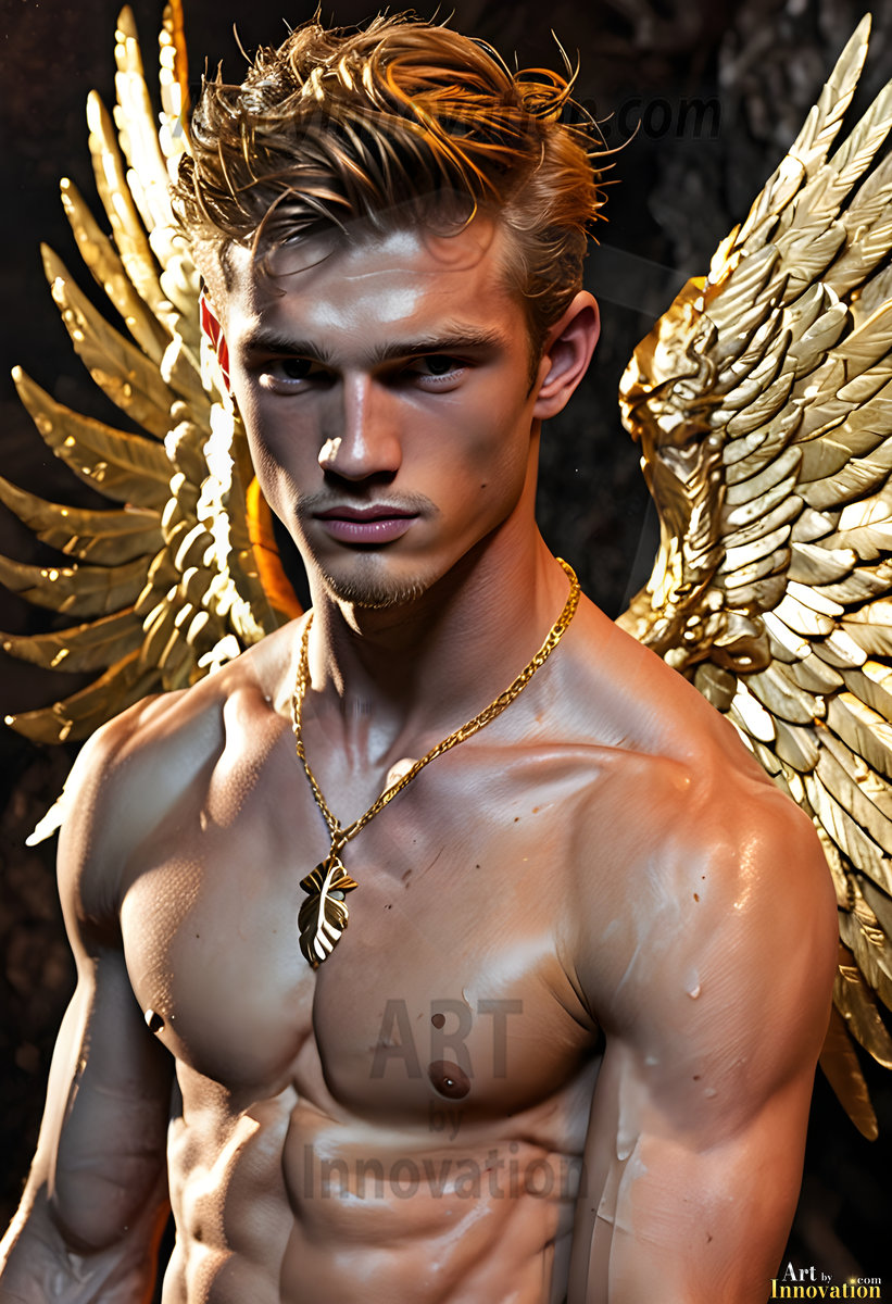God's most radiant warriors. This AI-generated golden angel collection features stunningly handsome male angels with enormous golden feathered wings, bathed in golden radiant light rays and divine halo lighting. Set against backdrops ranging from chaotic battlefields to celestial heavenly realms, each golden angel radiates a divine beauty that is both commanding and breathtaking. Created using Flux.1 and ComfyUI by © Jeff Dupler | Art by Innovation | https://www.artbyinnovation.com