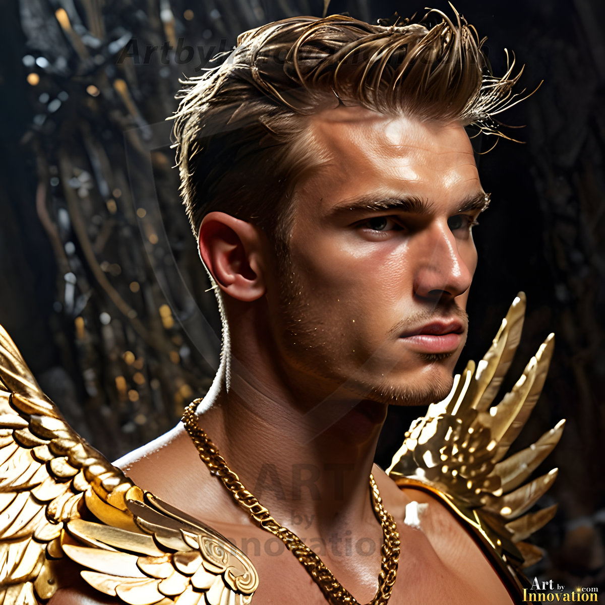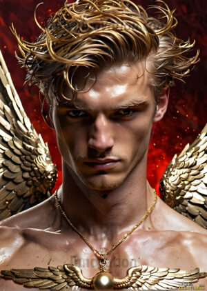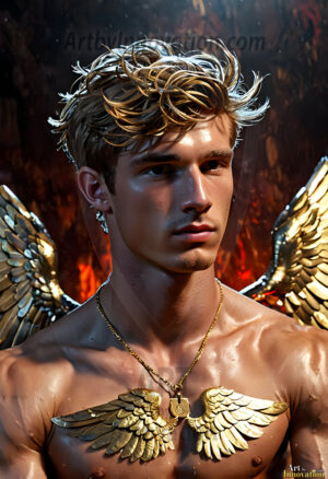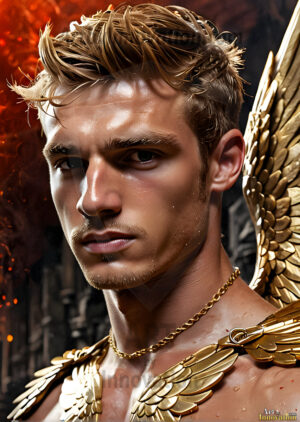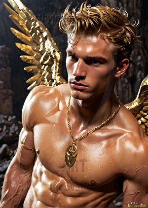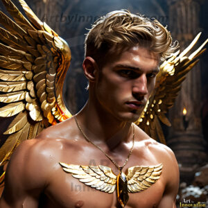 ByjeffHandsome AI-generated male warrior angels in divine holy armor with vibrant wings — God’s warriors in the golden city of heaven.