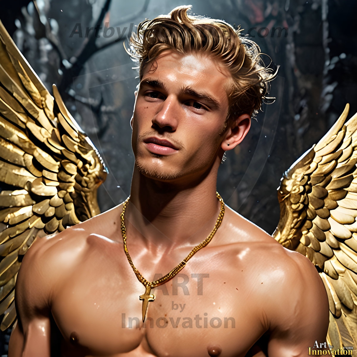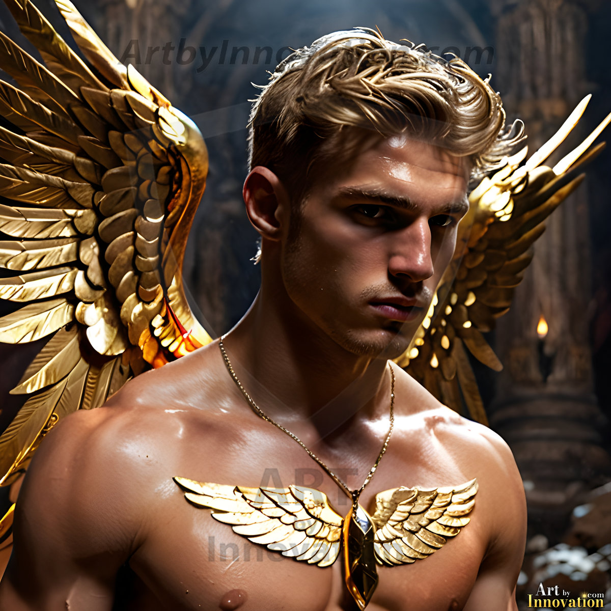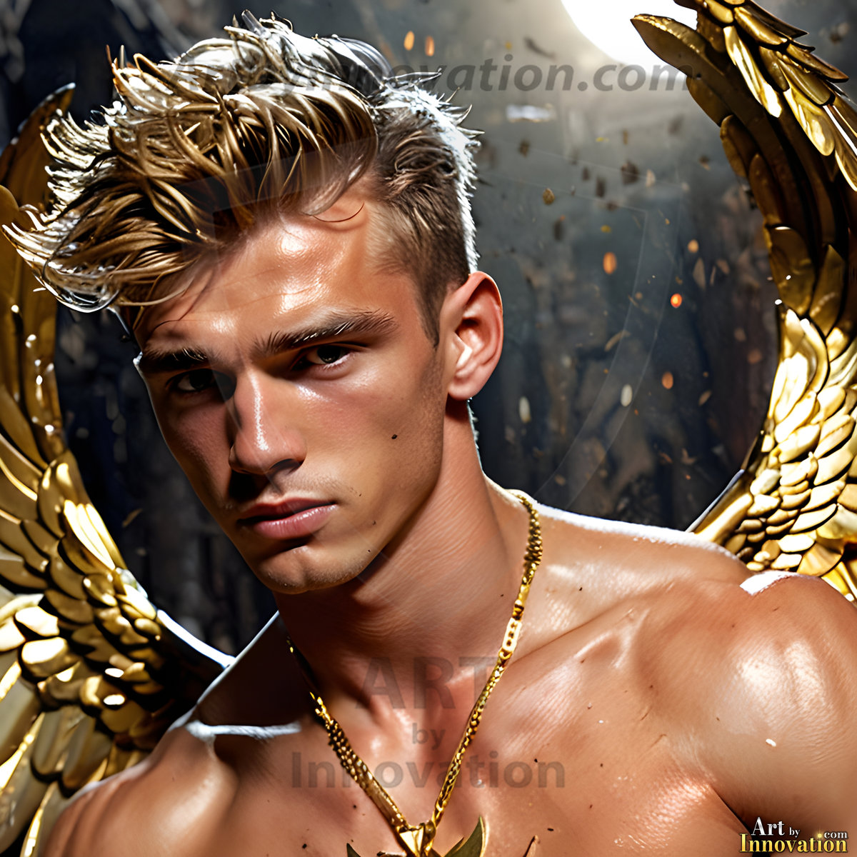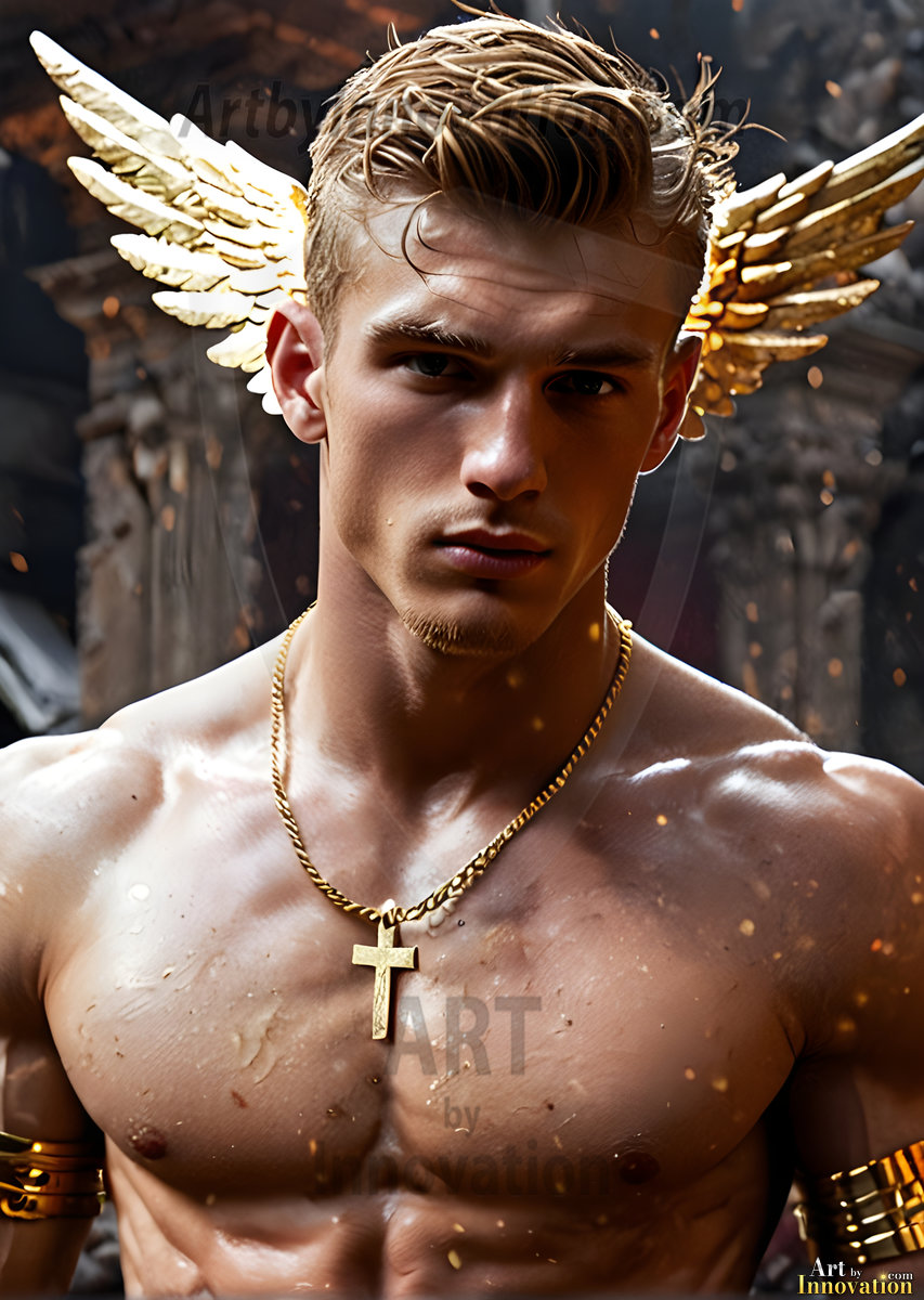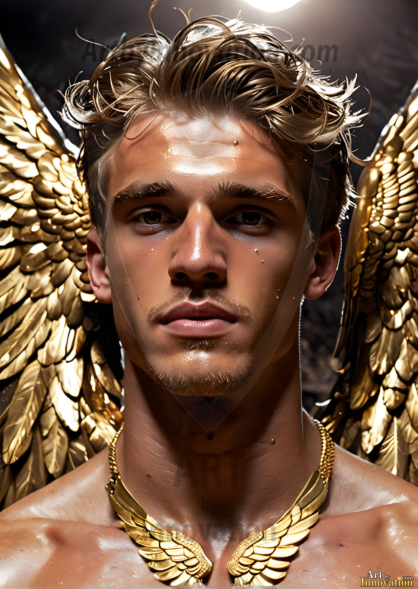 God's most radiant warriors. This AI-generated golden angel collection features stunningly handsome male angels with enormous golden feathered wings, bathed in golden radiant light rays and divine halo lighting. Set against backdrops ranging from chaotic battlefields to celestial heavenly realms, each golden angel radiates a divine beauty that is both commanding and breathtaking. Created using Flux.1 and ComfyUI by © Jeff Dupler | Art by Innovation | https://www.artbyinnovation.com