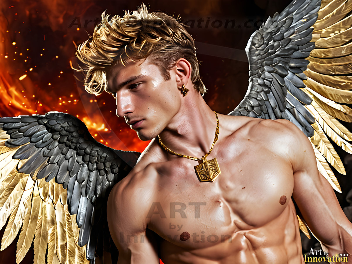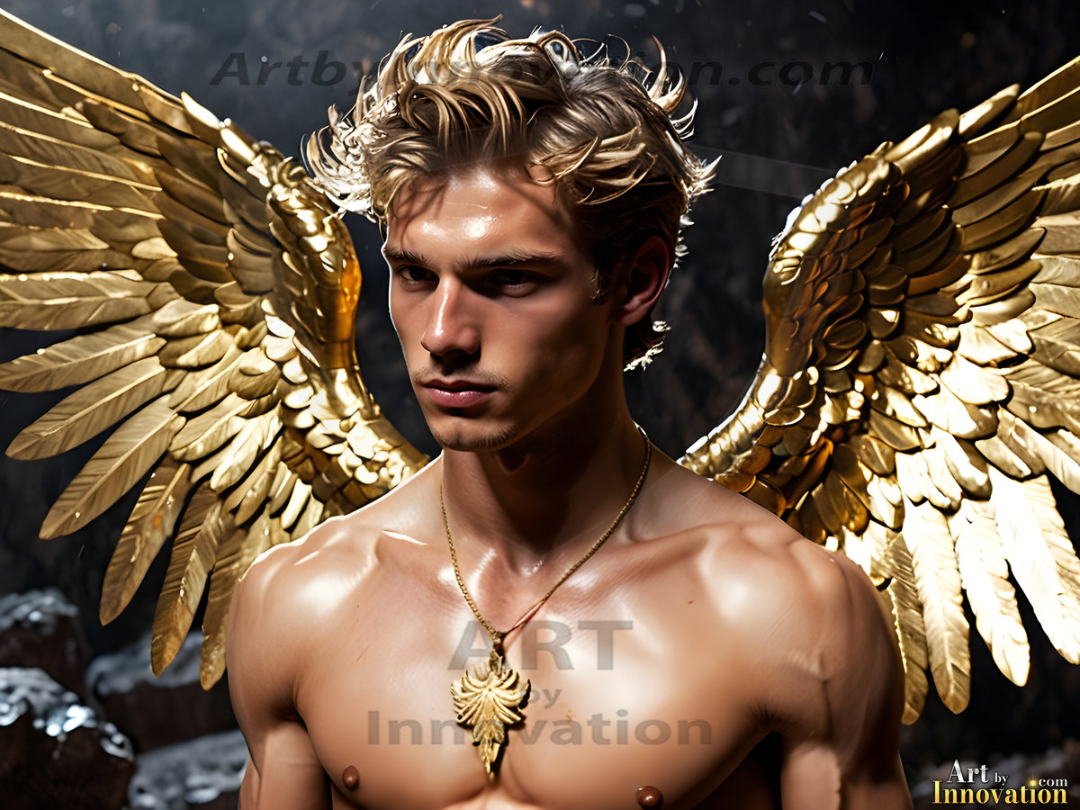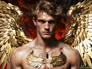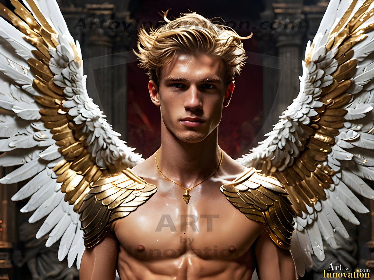 God's most radiant warriors. This AI-generated golden angel collection features stunningly handsome male angels with enormous golden feathered wings, bathed in golden radiant light rays and divine halo lighting. Set against backdrops ranging from chaotic battlefields to celestial heavenly realms, each golden angel radiates a divine beauty that is both commanding and breathtaking. Created using Flux.1 and ComfyUI by © Jeff Dupler | Art by Innovation | https://www.artbyinnovation.com