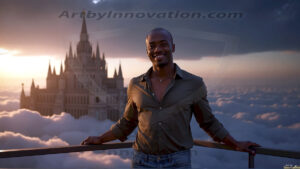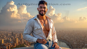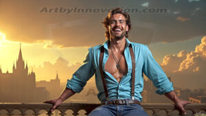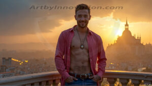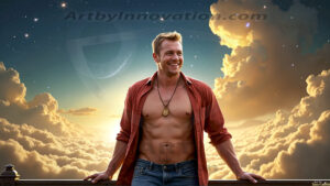 ByjeffThe Beautiful & Handsome Men of the Golden City, is a collection of AI generated images of sexy, glamorous, handsome guys in the heavens. In this fantasy photograph of a young men in their 30’s and 40’s, on a balcony, overlooking a large golden city in the heavens. Generated to be as realistic as possible, in this this fantasy setting, with todays technology. Wearing jeans, an unbuttoned, vibrant, long-sleeve, button down shirt. The subject is enjoying a beautiful day outdoors. The mystical, galactic landscape, and the vibrant cosmic canopies, every detail, from the texture of the clouds, to the magnificent, majestic gothic architecture of the golden city, is crafted to create an atmosphere of reverence and divine glory. With a breathtaking scene of Salar de Uyuni at sunset, offering warm golden hour lighting. The heavenly landscape evokes a sense of freedom and tranquility, that is expresses through his facial features and smile, as day turns to night. The heavenly landscape evokes a sense of mysterious black space and light, with a vast galaxy that almost covers the image, the stars and constellations sparkle bright, in dark blue sky. On occasion the earth can be seen floating in the sky.