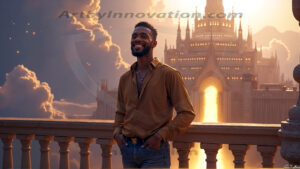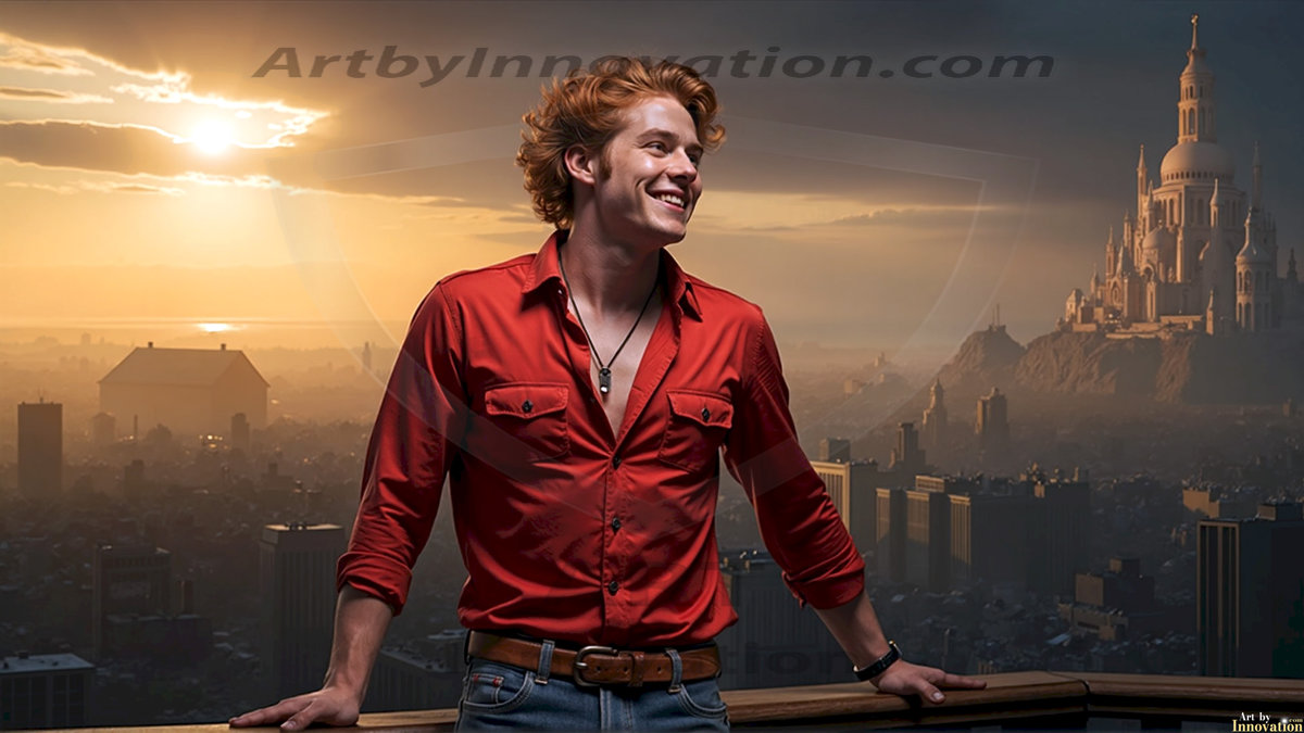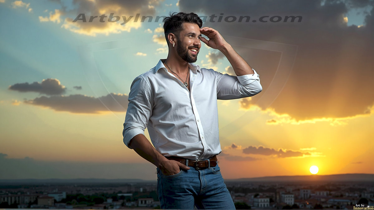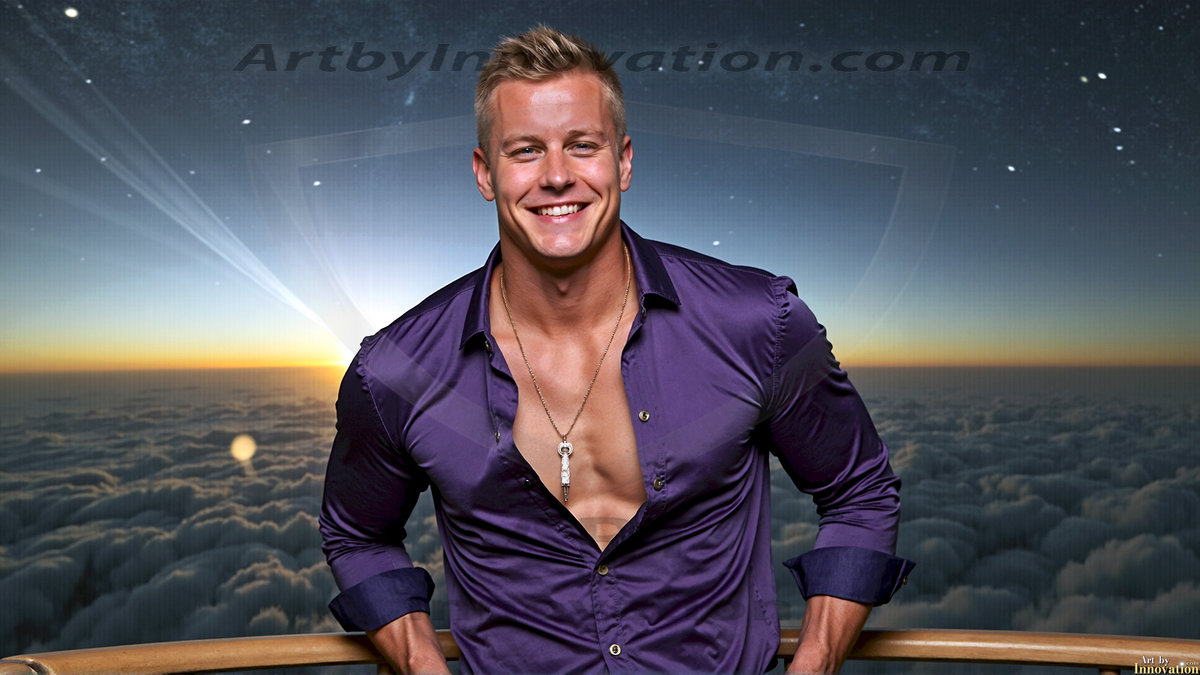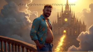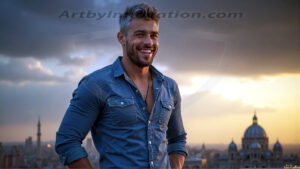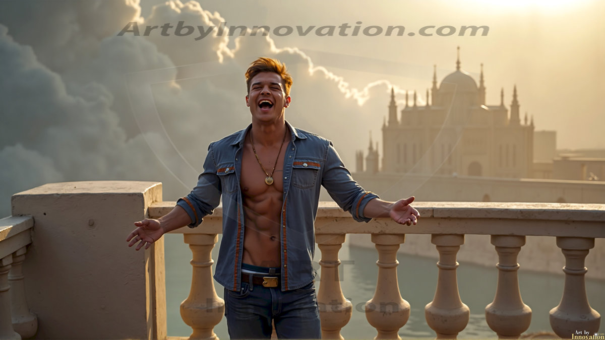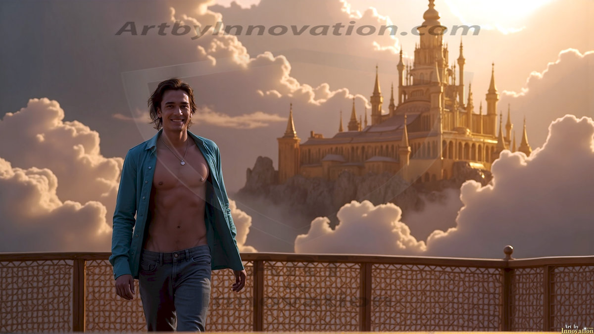 ByjeffThe Beautiful Young Men of the Golden City, is a collection of AI generated images of sexy, glamorous, handsome guys in the heavens. In this fantasy photograph of a young men in their 20’s, on a balcony, overlooking a large golden city in the heavens. Generated to be as realistic as possible, in this this fantasy setting, with todays technology. Wearing jeans, an unbuttoned, vibrant, long-sleeve, button down shirt. The subject is enjoying a beautiful day outdoors. The mystical, galactic landscape, and the vibrant cosmic canopies, every detail, from the texture of the clouds, to the magnificent, majestic gothic architecture of the golden city, is crafted to create an atmosphere of reverence and divine glory. With a breathtaking scene of Salar de Uyuni at sunset, offering warm golden hour lighting. The heavenly landscape evokes a sense of freedom and tranquility, that is expresses through his facial features and smile, as day turns to night. The heavenly landscape evokes a sense of mysterious black space and light, with a vast galaxy that almost covers the image, the stars and constellations sparkle bright, in dark blue sky. On occasion the earth can be seen floating in the sky.
