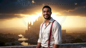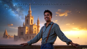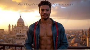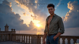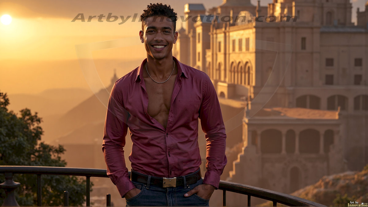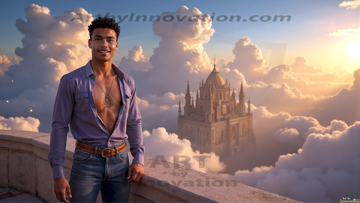 ByjeffThe Beautiful Young Men of the Golden City, is a collection of AI generated images of sexy, glamorous, handsome guys in the heavens. In this fantasy photograph of a young men in their 20’s, on a balcony, overlooking a large golden city in the heavens. Generated to be as realistic as possible, in this this fantasy setting, with todays technology. Wearing jeans, an unbuttoned, vibrant, long-sleeve, button down shirt. The subject is enjoying a beautiful day outdoors. The mystical, galactic landscape, and the vibrant cosmic canopies, every detail, from the texture of the clouds, to the magnificent, majestic gothic architecture of the golden city, is crafted to create an atmosphere of reverence and divine glory. With a breathtaking scene of Salar de Uyuni at sunset, offering warm golden hour lighting. The heavenly landscape evokes a sense of freedom and tranquility, that is expresses through his facial features and smile, as day turns to night. The heavenly landscape evokes a sense of mysterious black space and light, with a vast galaxy that almost covers the image, the stars and constellations sparkle bright, in dark blue sky. On occasion the earth can be seen floating in the sky.