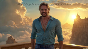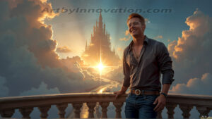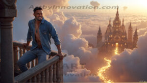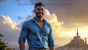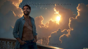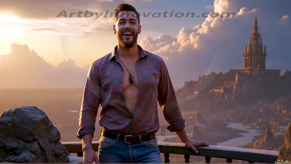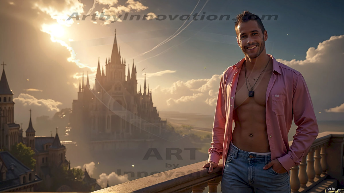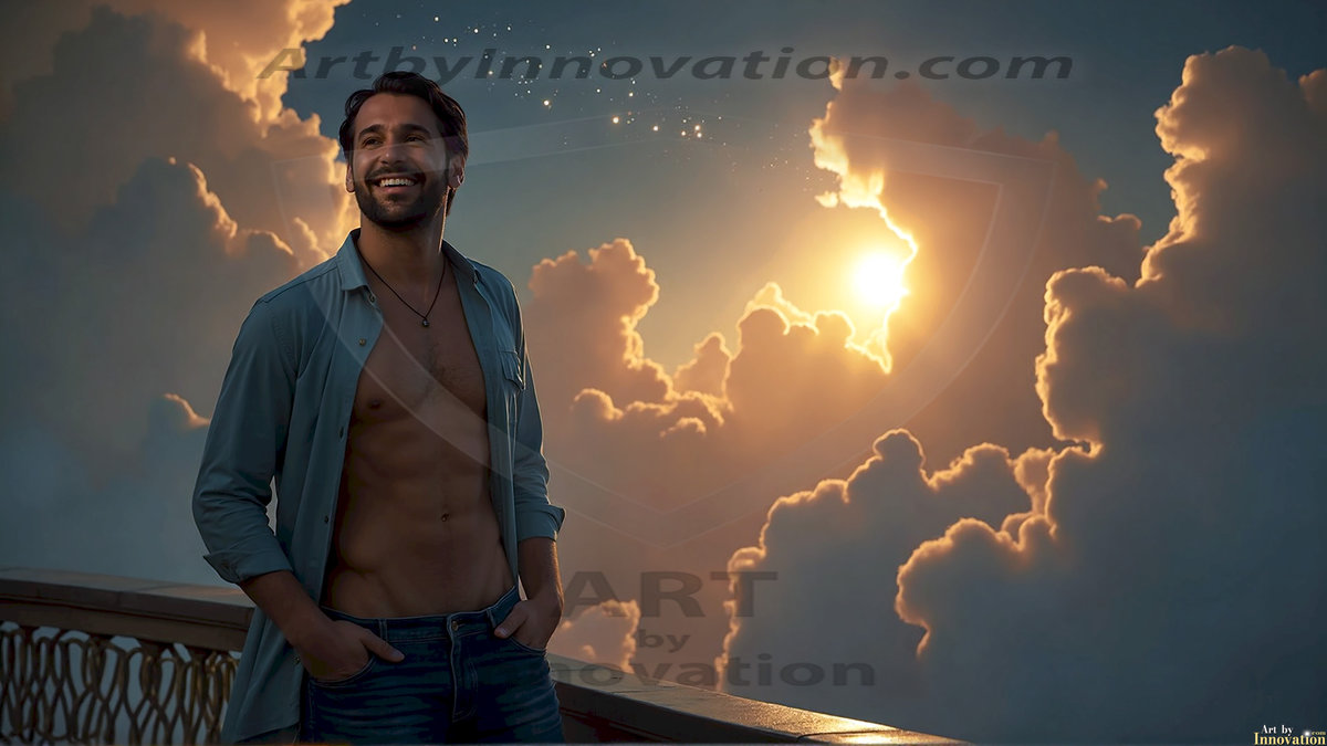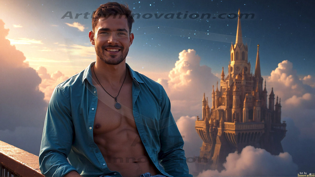 ByjeffThe Beautiful Young Men of the Golden City, is a collection of AI generated images of sexy, glamorous, handsome guys in the heavens. In this fantasy photograph of a young men in their 20’s, on a balcony, overlooking a large golden city in the heavens. Generated to be as realistic as possible, in this this fantasy setting, with todays technology. Wearing jeans, an unbuttoned, vibrant, long-sleeve, button down shirt. The subject is enjoying a beautiful day outdoors. The mystical, galactic landscape, and the vibrant cosmic canopies, every detail, from the texture of the clouds, to the magnificent, majestic gothic architecture of the golden city, is crafted to create an atmosphere of reverence and divine glory. With a breathtaking scene of Salar de Uyuni at sunset, offering warm golden hour lighting. The heavenly landscape evokes a sense of freedom and tranquility, that is expresses through his facial features and smile, as day turns to night. The heavenly landscape evokes a sense of mysterious black space and light, with a vast galaxy that almost covers the image, the stars and constellations sparkle bright, in dark blue sky. On occasion the earth can be seen floating in the sky.