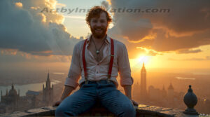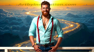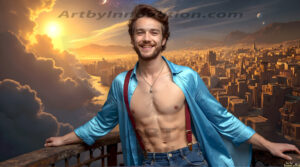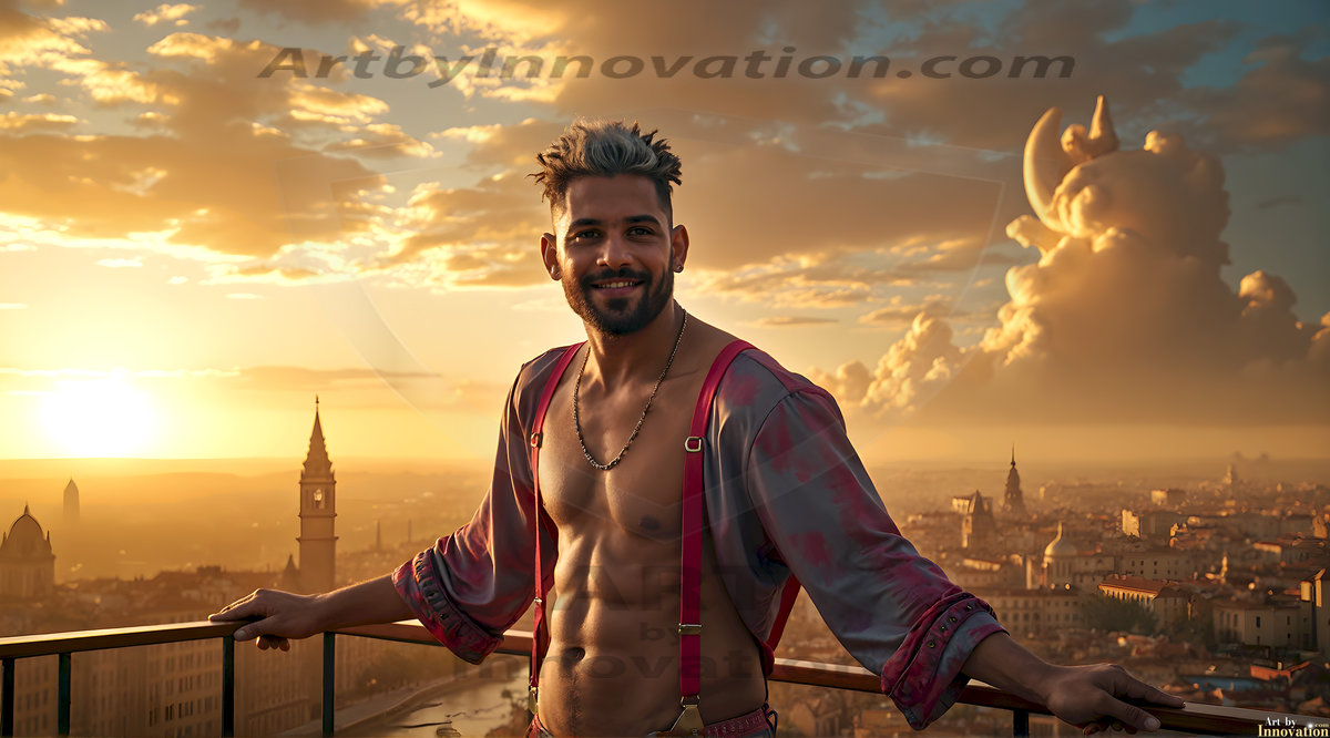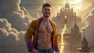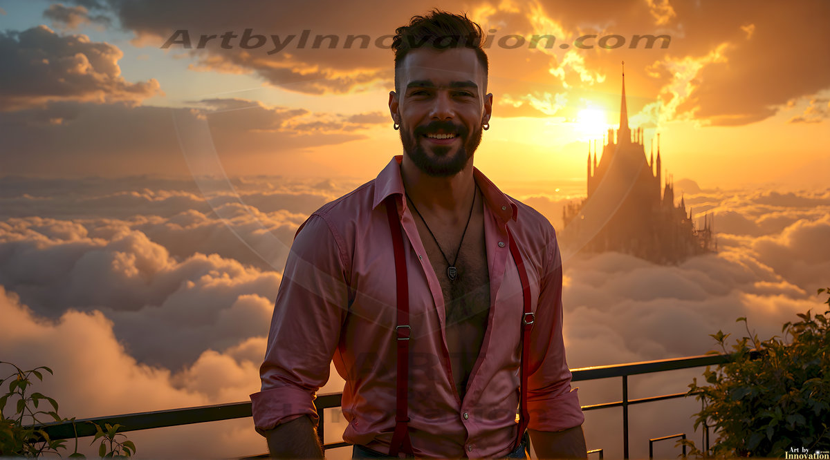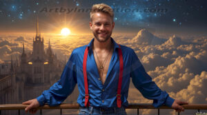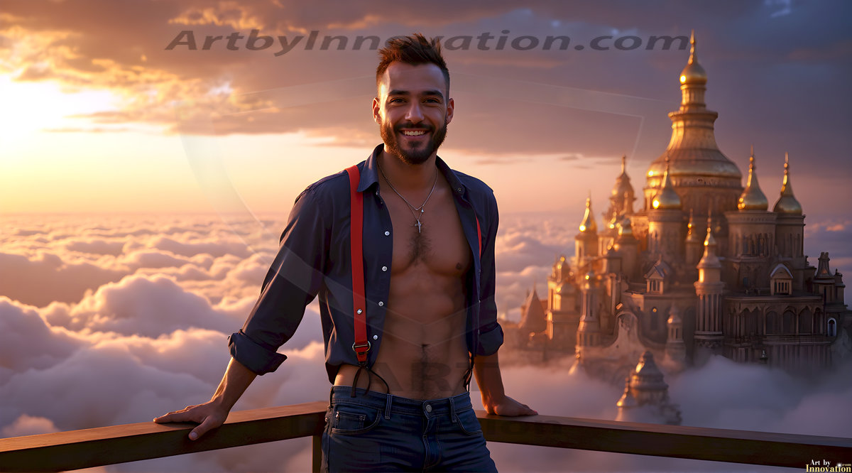 ByjeffThe Beautiful & Handsome Men of the Golden City, is a collection of AI generated images of sexy, glamorous, handsome guys in the heavens. In this fantasy photograph of a young men in their 30’s and 40’s, on a balcony, overlooking a large golden city in the heavens. Generated to be as realistic as possible, in this this fantasy setting, with todays technology. Wearing jeans, an unbuttoned, vibrant, long-sleeve, button down shirt. The subject is enjoying a beautiful day outdoors. The mystical, galactic landscape, and the vibrant cosmic canopies, every detail, from the texture of the clouds, to the magnificent, majestic gothic architecture of the golden city, is crafted to create an atmosphere of reverence and divine glory. With a breathtaking scene of Salar de Uyuni at sunset, offering warm golden hour lighting. The heavenly landscape evokes a sense of freedom and tranquility, that is expresses through his facial features and smile, as day turns to night. The heavenly landscape evokes a sense of mysterious black space and light, with a vast galaxy that almost covers the image, the stars and constellations sparkle bright, in dark blue sky. On occasion the earth can be seen floating in the sky.