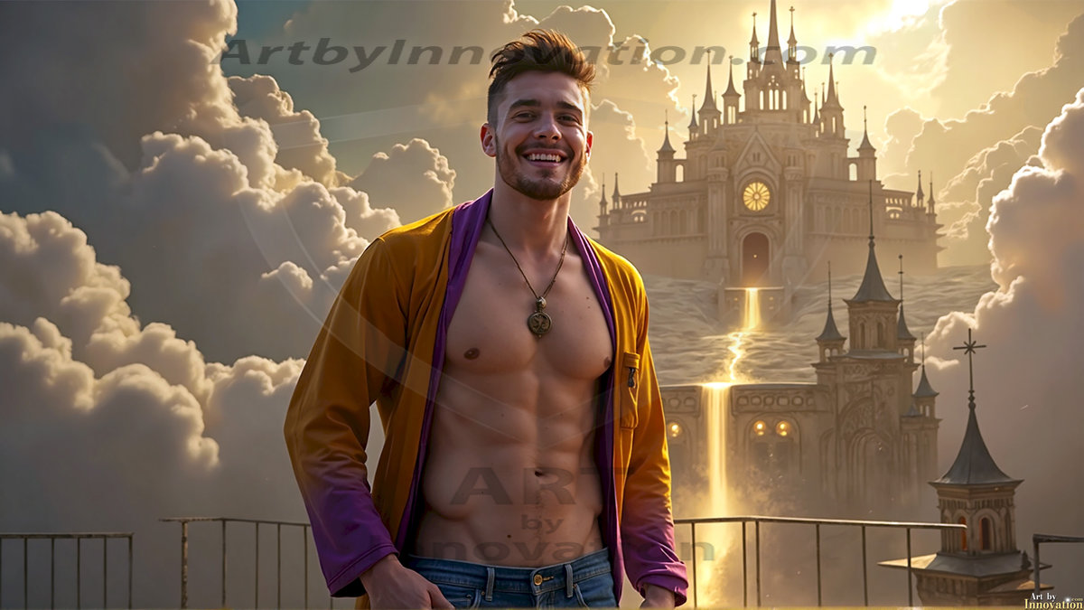 Welcome to the Golden City. This AI-generated collection features beautiful, glamorous, handsome men on balconies overlooking a breathtaking golden city in the heavens — massive majestic gothic architecture, golden rivers flowing to the edge of the galaxy, stars and constellations sparkling in a vast cosmic sky. Each image evokes a sense of reverence, freedom, and divine glory. Available in young men (teens and 20s), mature men, and Daddies editions. Created using Flux.1 and ComfyUI by © Jeff Dupler | Art by Innovation | https://www.artbyinnovation.com