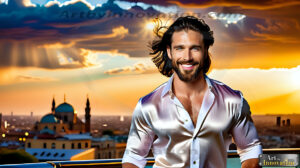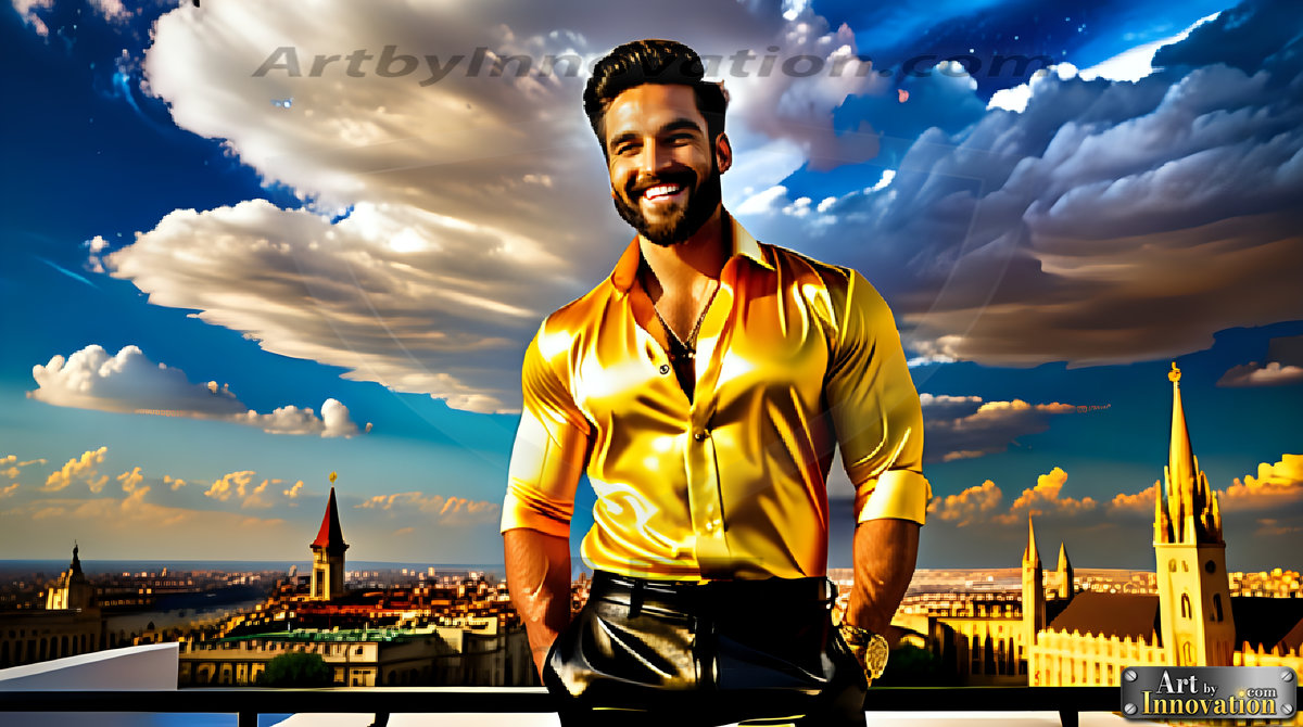 The Beautiful & Handsome Men of the Golden City, is a collection of AI generated images of sexy, glamorous, handsome guys in the heavens. In this fantasy photograph of a young men in their 30’s and 40’s, on a balcony, overlooking a large golden city in the heavens. Generated to be as realistic as possible, in this this fantasy setting, with todays technology. Wearing jeans, an unbuttoned, vibrant, long-sleeve, button down shirt. The subject is enjoying a beautiful day outdoors. The mystical, galactic landscape, and the vibrant cosmic canopies, every detail, from the texture of the clouds, to the magnificent, majestic gothic architecture of the golden city, is crafted to create an atmosphere of reverence and divine glory. With a breathtaking scene of Salar de Uyuni at sunset, offering warm golden hour lighting. The heavenly landscape evokes a sense of freedom and tranquility, that is expresses through his facial features and smile, as day turns to night. The heavenly landscape evokes a sense of mysterious black space and light, with a vast galaxy that almost covers the image, the stars and constellations sparkle bright, in dark blue sky. On occasion the earth can be seen floating in the sky.