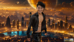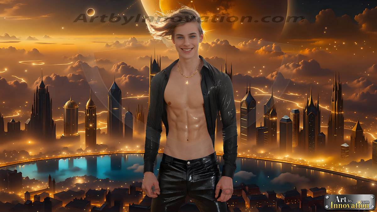 The Beautiful Young Men of the Golden City, is a collection of AI generated images of sexy, glamorous, handsome guys in the heavens. In this fantasy photograph of a young men in their 20’s, on a balcony, overlooking a large golden city in the heavens. Generated to be as realistic as possible, in this this fantasy setting, with todays technology. Wearing jeans, an unbuttoned, vibrant, long-sleeve, button down shirt. The subject is enjoying a beautiful day outdoors. The mystical, galactic landscape, and the vibrant cosmic canopies, every detail, from the texture of the clouds, to the magnificent, majestic gothic architecture of the golden city, is crafted to create an atmosphere of reverence and divine glory. With a breathtaking scene of Salar de Uyuni at sunset, offering warm golden hour lighting. The heavenly landscape evokes a sense of freedom and tranquility, that is expresses through his facial features and smile, as day turns to night. The heavenly landscape evokes a sense of mysterious black space and light, with a vast galaxy that almost covers the image, the stars and constellations sparkle bright, in dark blue sky. On occasion the earth can be seen floating in the sky.