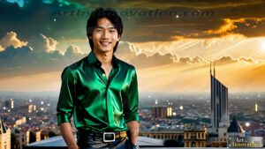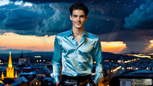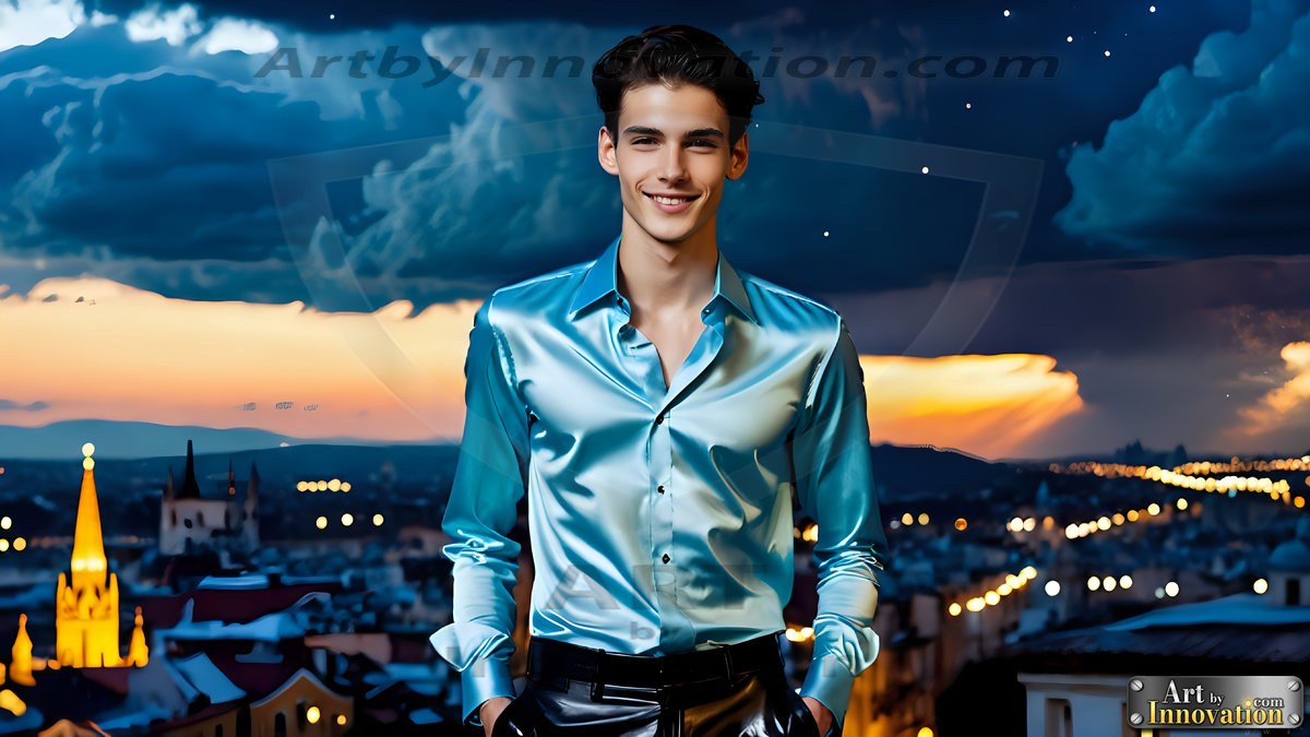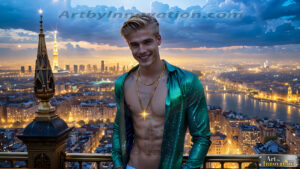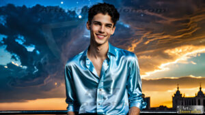 The Beautiful Young Men of the Golden City, is a collection of AI generated images of sexy, glamorous, handsome guys in the heavens. In this fantasy photograph of a young men in their 20’s, on a balcony, overlooking a large golden city in the heavens. Generated to be as realistic as possible, in this this fantasy setting, with todays technology. Wearing jeans, an unbuttoned, vibrant, long-sleeve, button down shirt. The subject is enjoying a beautiful day outdoors. The mystical, galactic landscape, and the vibrant cosmic canopies, every detail, from the texture of the clouds, to the magnificent, majestic gothic architecture of the golden city, is crafted to create an atmosphere of reverence and divine glory. With a breathtaking scene of Salar de Uyuni at sunset, offering warm golden hour lighting. The heavenly landscape evokes a sense of freedom and tranquility, that is expresses through his facial features and smile, as day turns to night. The heavenly landscape evokes a sense of mysterious black space and light, with a vast galaxy that almost covers the image, the stars and constellations sparkle bright, in dark blue sky. On occasion the earth can be seen floating in the sky.