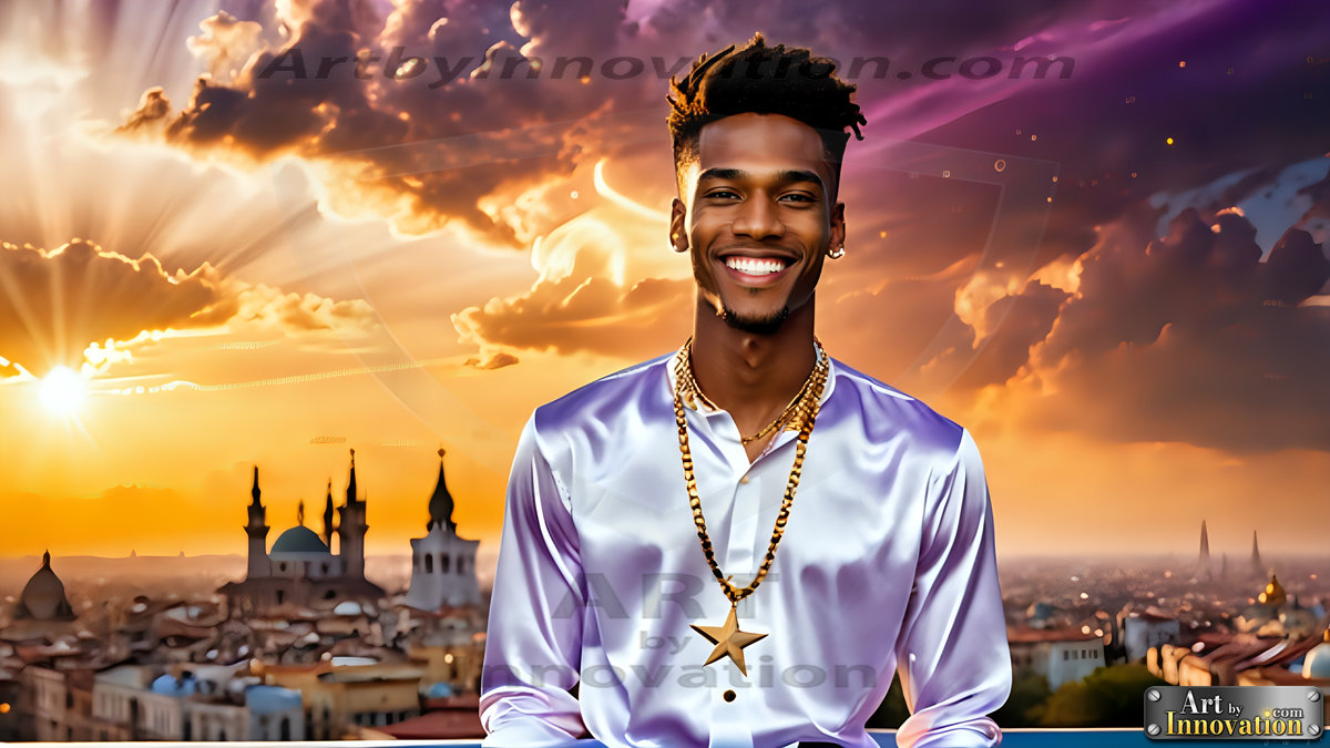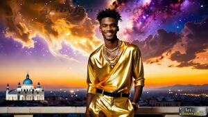 AI-generated art of handsome celestial spirits living on the outskirts of a majestic golden heavenly city — gothic architecture and galactic skies.