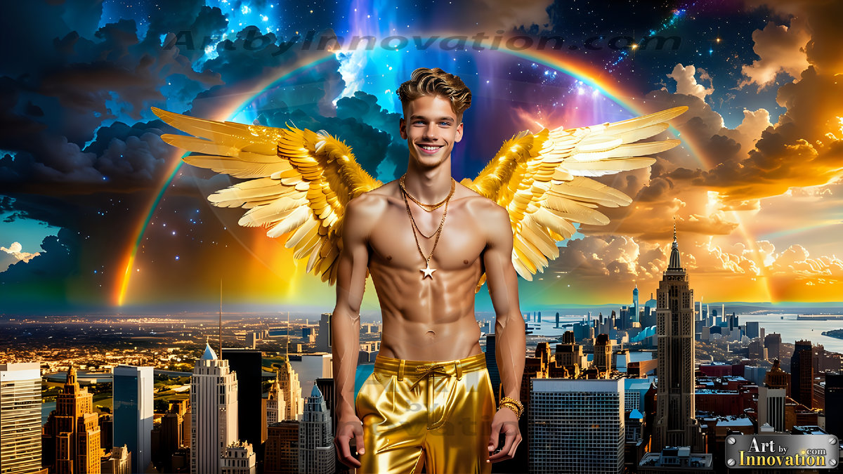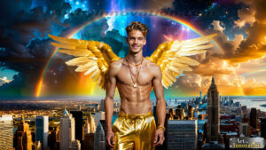 AI-generated LGBTQ Pride art — beautiful handsome men embellished with the vibrant rainbow colors of the gay pride flag. 500+ images.