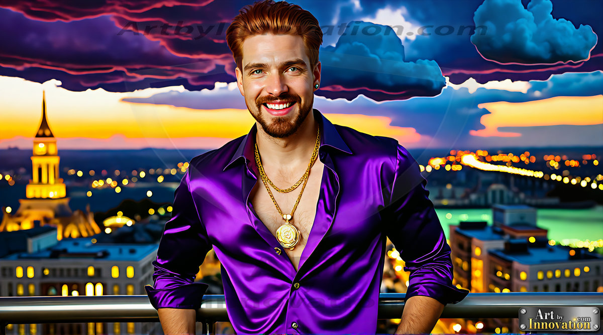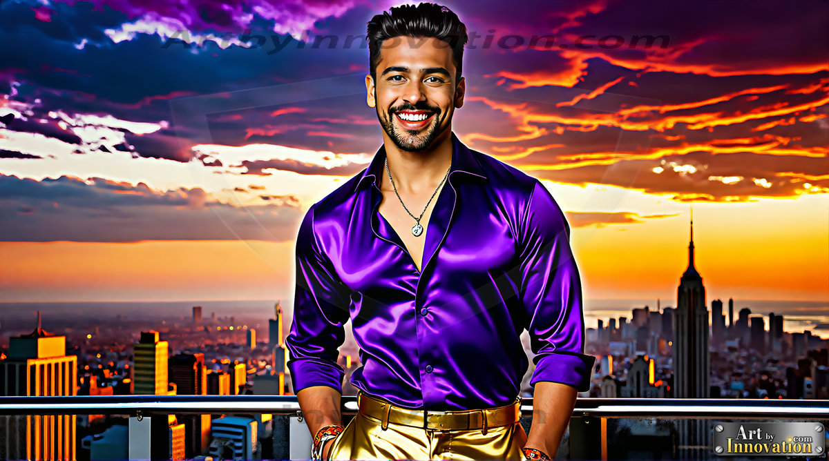 The Beautiful & Handsome Men of the Golden City, is a collection of AI generated images of sexy, glamorous, handsome guys in the heavens. In this fantasy photograph of a young men in their 30’s and 40’s, on a balcony, overlooking a large golden city in the heavens. Generated to be as realistic as possible, in this this fantasy setting, with todays technology. Wearing jeans, an unbuttoned, vibrant, long-sleeve, button down shirt. The subject is enjoying a beautiful day outdoors. The mystical, galactic landscape, and the vibrant cosmic canopies, every detail, from the texture of the clouds, to the magnificent, majestic gothic architecture of the golden city, is crafted to create an atmosphere of reverence and divine glory. With a breathtaking scene of Salar de Uyuni at sunset, offering warm golden hour lighting. The heavenly landscape evokes a sense of freedom and tranquility, that is expresses through his facial features and smile, as day turns to night. The heavenly landscape evokes a sense of mysterious black space and light, with a vast galaxy that almost covers the image, the stars and constellations sparkle bright, in dark blue sky. On occasion the earth can be seen floating in the sky.