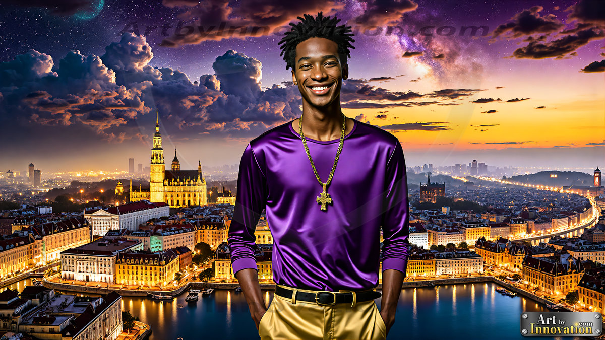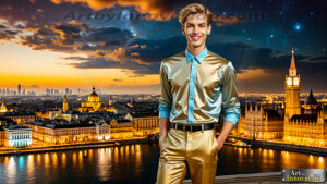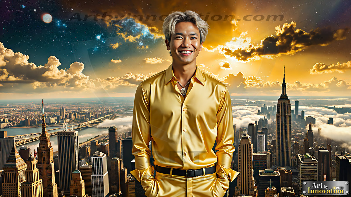 The Beautiful Young Men of the Golden City, is a collection of AI generated images of sexy, glamorous, handsome guys in the heavens. In this fantasy photograph of a young men in their 20’s, on a balcony, overlooking a large golden city in the heavens. Generated to be as realistic as possible, in this this fantasy setting, with todays technology. Wearing jeans, an unbuttoned, vibrant, long-sleeve, button down shirt. The subject is enjoying a beautiful day outdoors. The mystical, galactic landscape, and the vibrant cosmic canopies, every detail, from the texture of the clouds, to the magnificent, majestic gothic architecture of the golden city, is crafted to create an atmosphere of reverence and divine glory. With a breathtaking scene of Salar de Uyuni at sunset, offering warm golden hour lighting. The heavenly landscape evokes a sense of freedom and tranquility, that is expresses through his facial features and smile, as day turns to night. The heavenly landscape evokes a sense of mysterious black space and light, with a vast galaxy that almost covers the image, the stars and constellations sparkle bright, in dark blue sky. On occasion the earth can be seen floating in the sky.