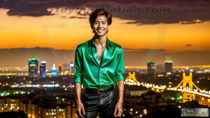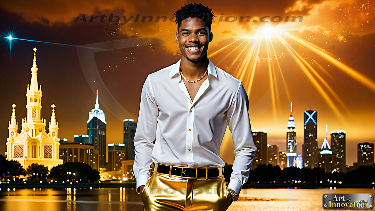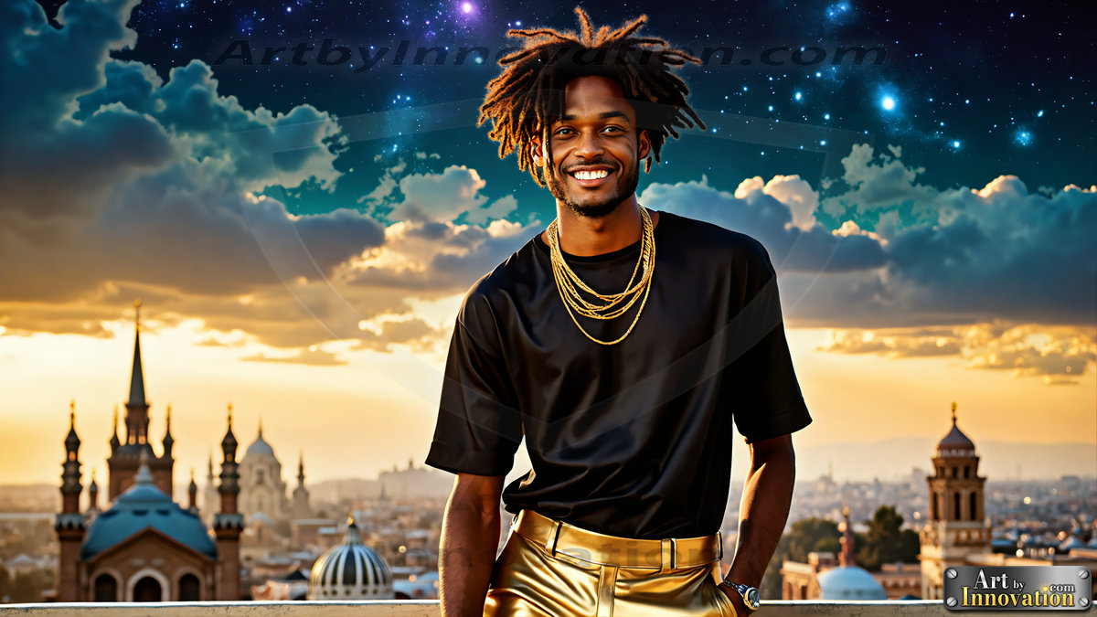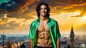 The Beautiful Young Men of the Golden City, is a collection of AI generated images of sexy, glamorous, handsome guys in the heavens. In this fantasy photograph of a young men in their 20’s, on a balcony, overlooking a large golden city in the heavens. Generated to be as realistic as possible, in this this fantasy setting, with todays technology. Wearing jeans, an unbuttoned, vibrant, long-sleeve, button down shirt. The subject is enjoying a beautiful day outdoors. The mystical, galactic landscape, and the vibrant cosmic canopies, every detail, from the texture of the clouds, to the magnificent, majestic gothic architecture of the golden city, is crafted to create an atmosphere of reverence and divine glory. With a breathtaking scene of Salar de Uyuni at sunset, offering warm golden hour lighting. The heavenly landscape evokes a sense of freedom and tranquility, that is expresses through his facial features and smile, as day turns to night. The heavenly landscape evokes a sense of mysterious black space and light, with a vast galaxy that almost covers the image, the stars and constellations sparkle bright, in dark blue sky. On occasion the earth can be seen floating in the sky.