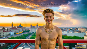 Handsome AI-generated men overlooking a majestic golden city in the heavens — gothic architecture, galactic skies, divine glory.