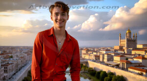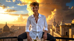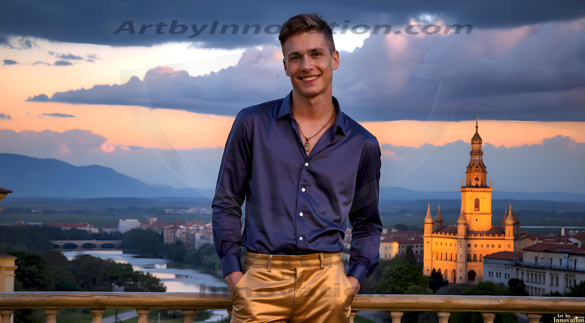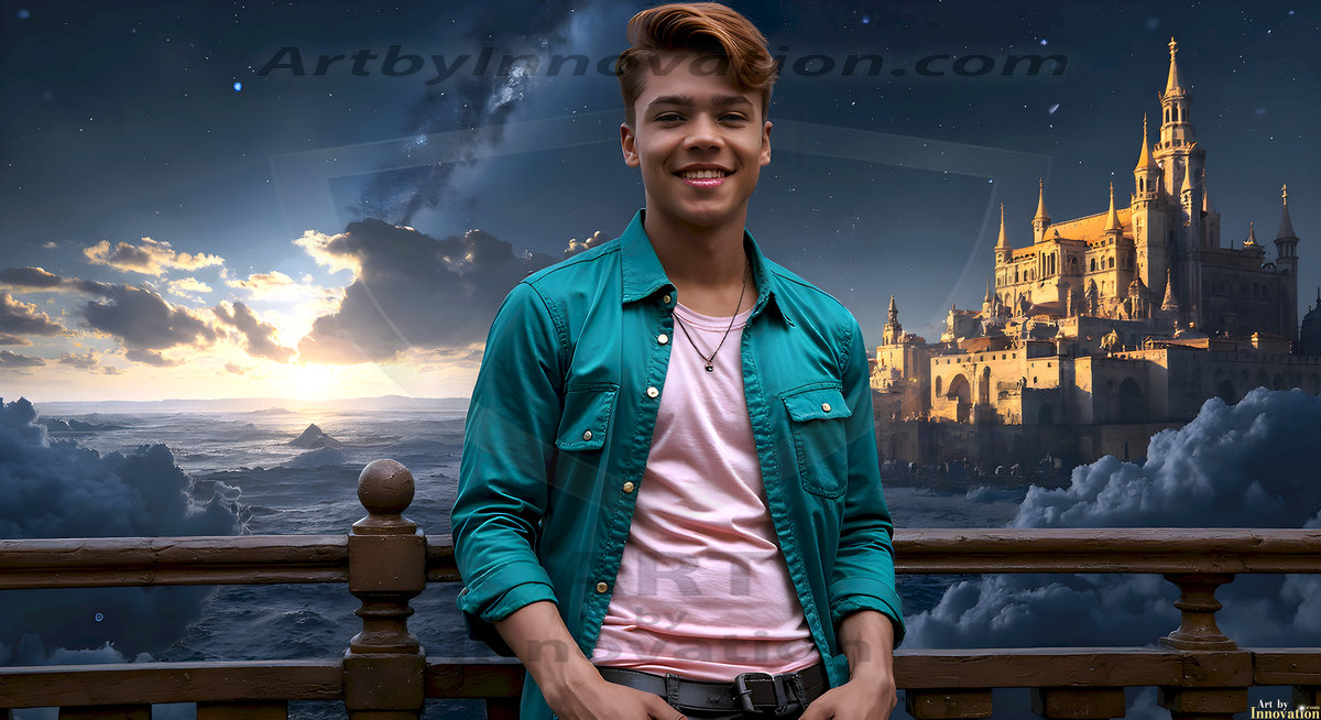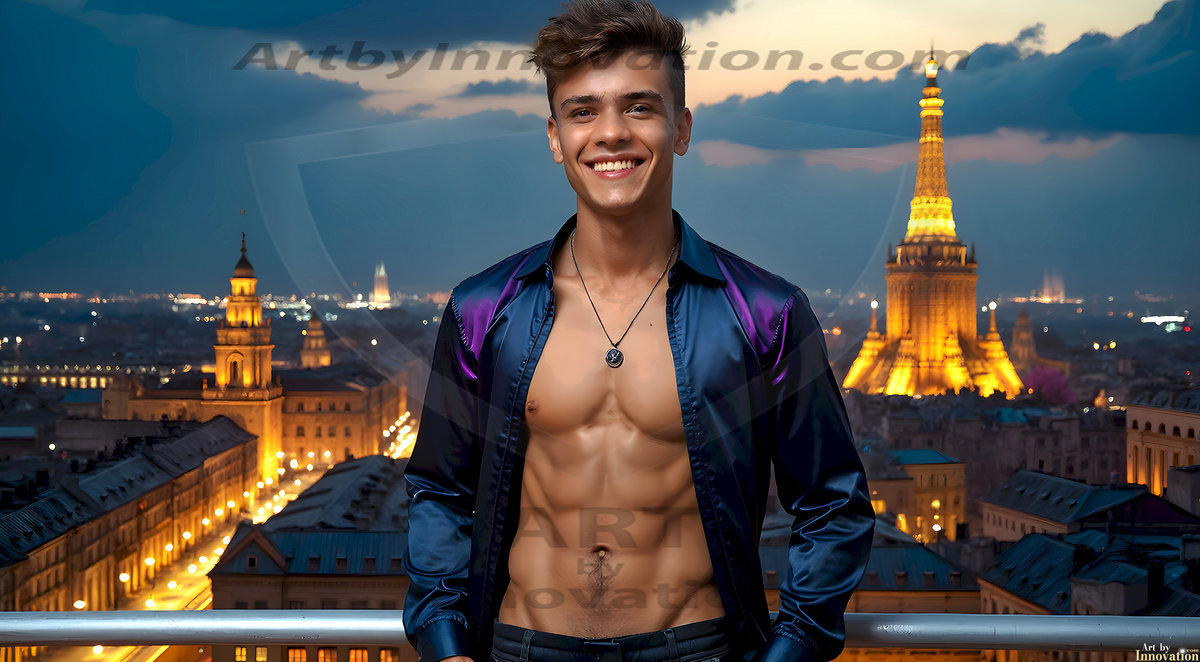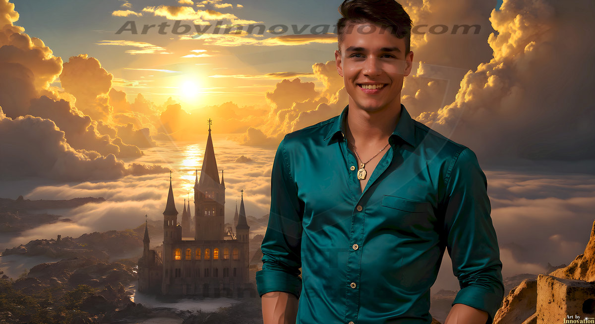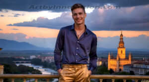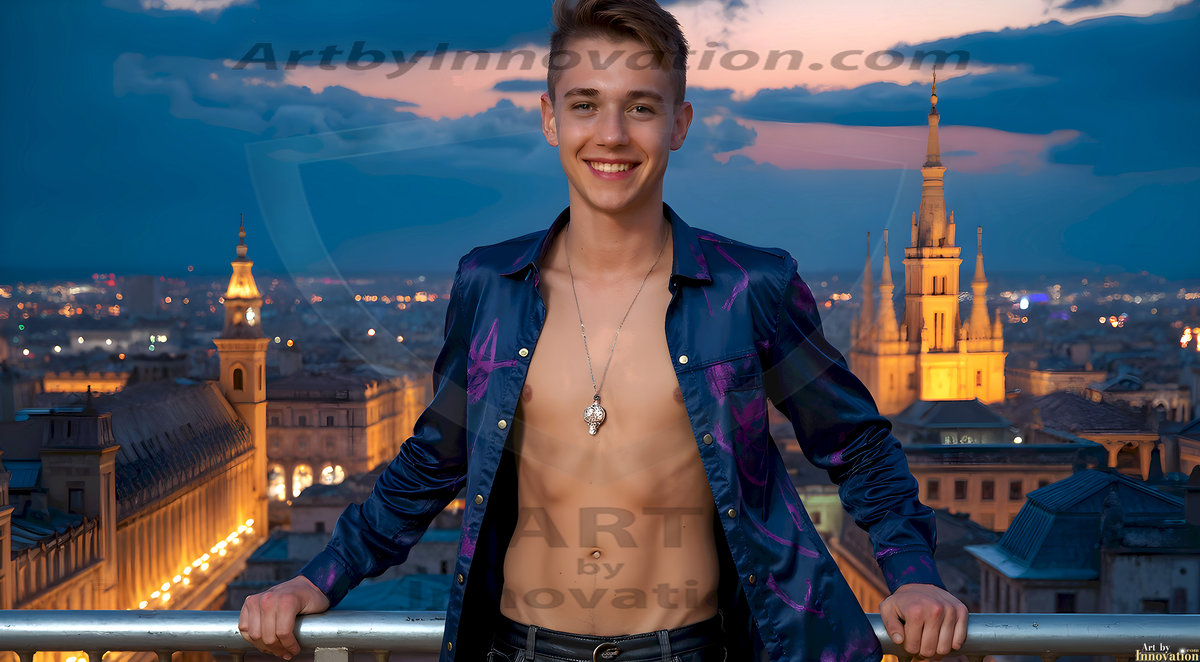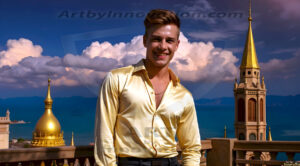 The Beautiful & Handsome Men of the Golden City, is a collection of AI generated images of sexy, glamorous, handsome guys in the heavens. In this fantasy photograph of a young men in their 30’s and 40’s, on a balcony, overlooking a large golden city in the heavens. Generated to be as realistic as possible, in this this fantasy setting, with todays technology. Wearing jeans, an unbuttoned, vibrant, long-sleeve, button down shirt. The subject is enjoying a beautiful day outdoors. The mystical, galactic landscape, and the vibrant cosmic canopies, every detail, from the texture of the clouds, to the magnificent, majestic gothic architecture of the golden city, is crafted to create an atmosphere of reverence and divine glory. With a breathtaking scene of Salar de Uyuni at sunset, offering warm golden hour lighting. The heavenly landscape evokes a sense of freedom and tranquility, that is expresses through his facial features and smile, as day turns to night. The heavenly landscape evokes a sense of mysterious black space and light, with a vast galaxy that almost covers the image, the stars and constellations sparkle bright, in dark blue sky. On occasion the earth can be seen floating in the sky.