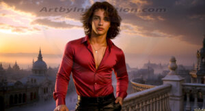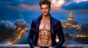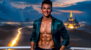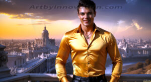 The Beautiful & Handsome Men of the Golden City, is a collection of AI generated images of sexy, glamorous, handsome guys in the heavens. In this fantasy photograph of a young men in their 30’s and 40’s, on a balcony, overlooking a large golden city in the heavens. Generated to be as realistic as possible, in this this fantasy setting, with todays technology. Wearing jeans, an unbuttoned, vibrant, long-sleeve, button down shirt. The subject is enjoying a beautiful day outdoors. The mystical, galactic landscape, and the vibrant cosmic canopies, every detail, from the texture of the clouds, to the magnificent, majestic gothic architecture of the golden city, is crafted to create an atmosphere of reverence and divine glory. With a breathtaking scene of Salar de Uyuni at sunset, offering warm golden hour lighting. The heavenly landscape evokes a sense of freedom and tranquility, that is expresses through his facial features and smile, as day turns to night. The heavenly landscape evokes a sense of mysterious black space and light, with a vast galaxy that almost covers the image, the stars and constellations sparkle bright, in dark blue sky. On occasion the earth can be seen floating in the sky.