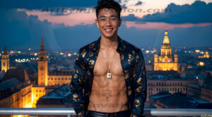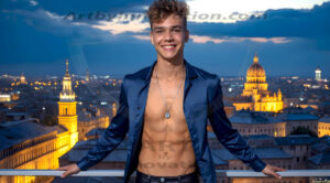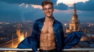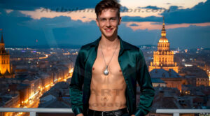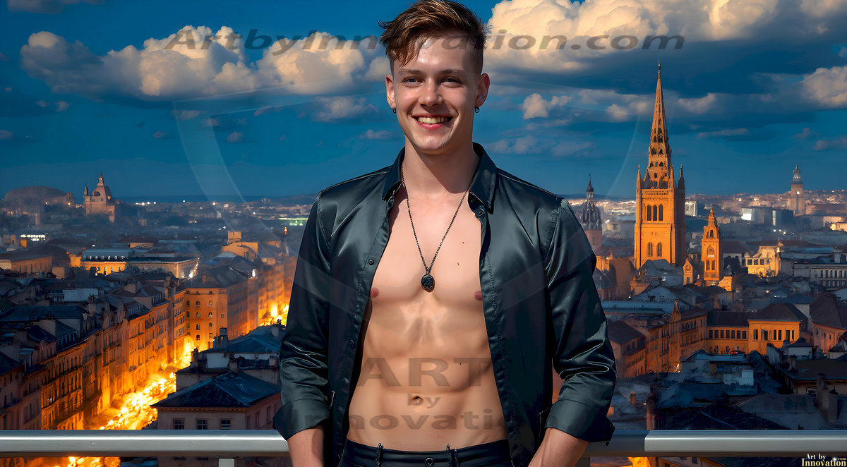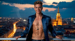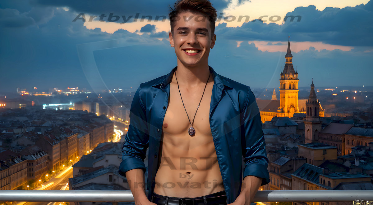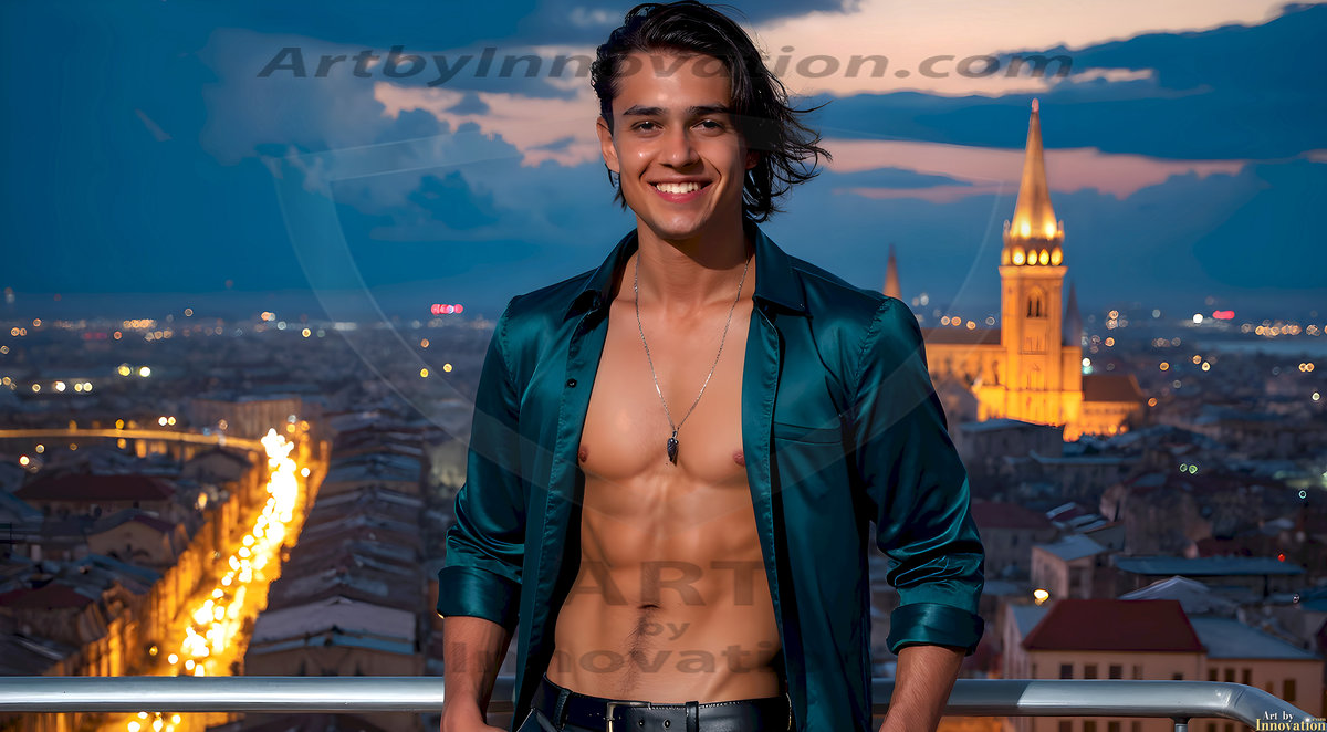 The Beautiful & Handsome Men of the Golden City, is a collection of AI generated images of sexy, glamorous, handsome guys in the heavens. In this fantasy photograph of a young men in their 30’s and 40’s, on a balcony, overlooking a large golden city in the heavens. Generated to be as realistic as possible, in this this fantasy setting, with todays technology. Wearing jeans, an unbuttoned, vibrant, long-sleeve, button down shirt. The subject is enjoying a beautiful day outdoors. The mystical, galactic landscape, and the vibrant cosmic canopies, every detail, from the texture of the clouds, to the magnificent, majestic gothic architecture of the golden city, is crafted to create an atmosphere of reverence and divine glory. With a breathtaking scene of Salar de Uyuni at sunset, offering warm golden hour lighting. The heavenly landscape evokes a sense of freedom and tranquility, that is expresses through his facial features and smile, as day turns to night. The heavenly landscape evokes a sense of mysterious black space and light, with a vast galaxy that almost covers the image, the stars and constellations sparkle bright, in dark blue sky. On occasion the earth can be seen floating in the sky.