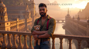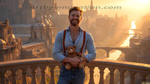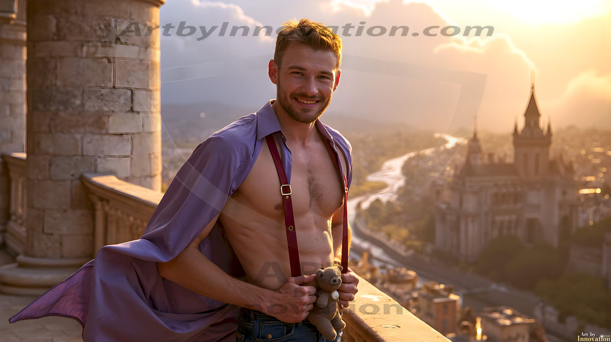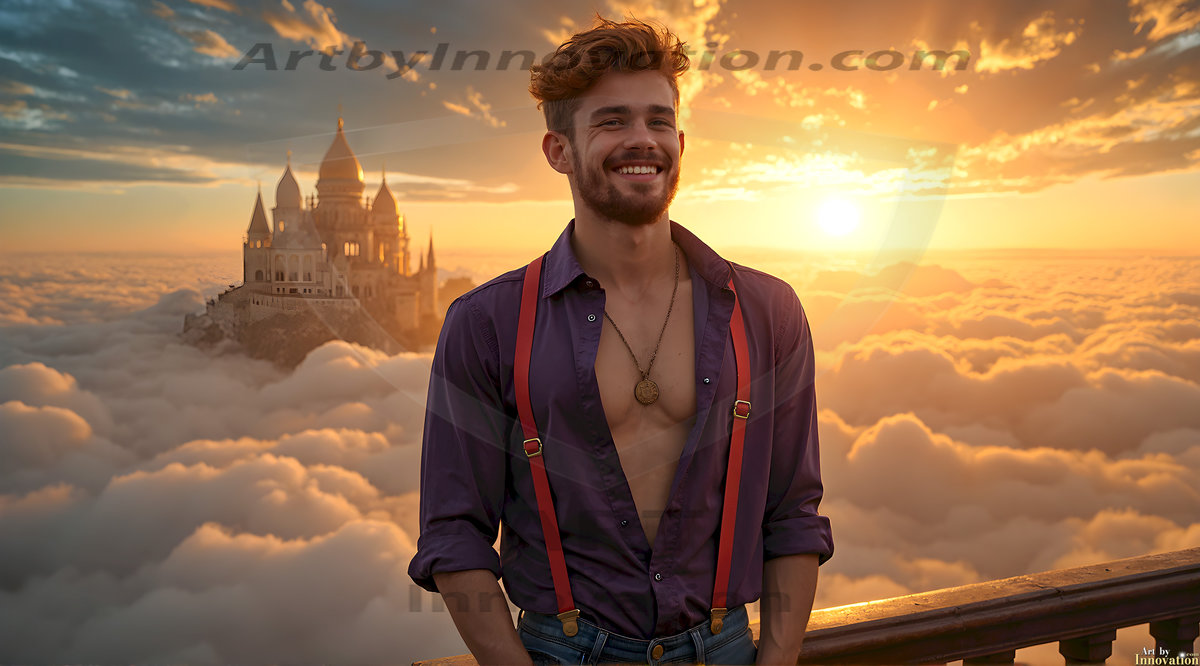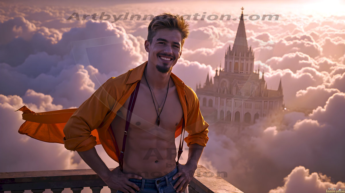 ByjeffThe Beautiful Young Men of the Golden City, is a collection of AI generated images of sexy, glamorous, handsome guys in the heavens. In this fantasy photograph of a young men in their 20’s, on a balcony, overlooking a large golden city in the heavens. Generated to be as realistic as possible, in this this fantasy setting, with todays technology. Wearing jeans, an unbuttoned, vibrant, long-sleeve, button down shirt. The subject is enjoying a beautiful day outdoors. The mystical, galactic landscape, and the vibrant cosmic canopies, every detail, from the texture of the clouds, to the magnificent, majestic gothic architecture of the golden city, is crafted to create an atmosphere of reverence and divine glory. With a breathtaking scene of Salar de Uyuni at sunset, offering warm golden hour lighting. The heavenly landscape evokes a sense of freedom and tranquility, that is expresses through his facial features and smile, as day turns to night. The heavenly landscape evokes a sense of mysterious black space and light, with a vast galaxy that almost covers the image, the stars and constellations sparkle bright, in dark blue sky. On occasion the earth can be seen floating in the sky.