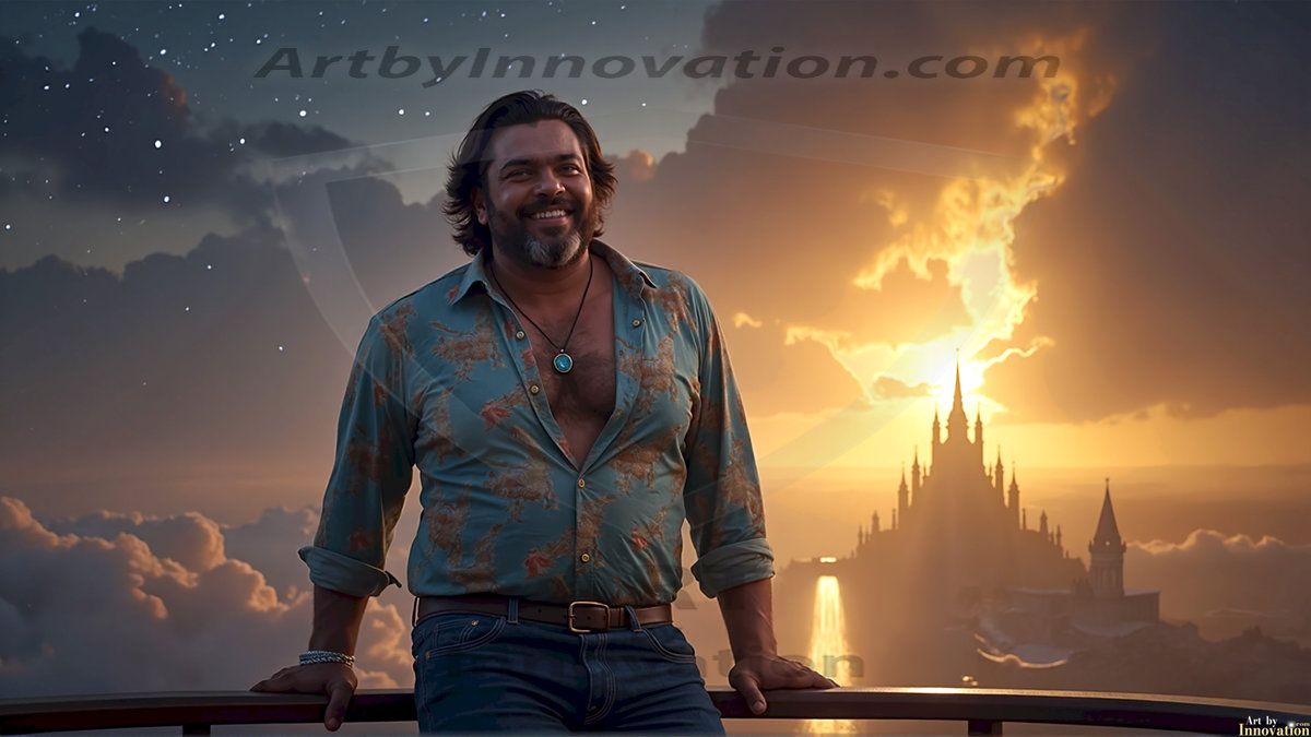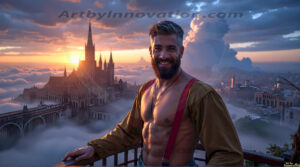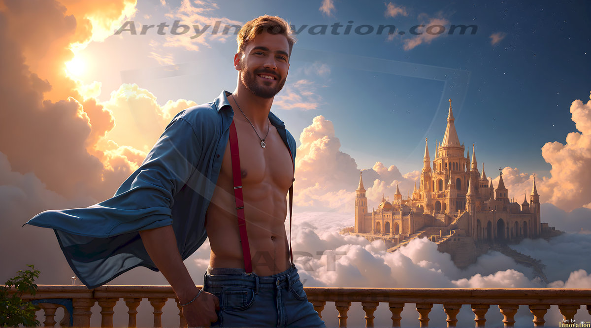 ByjeffThe Beautiful Young Men of the Golden City, is a collection of AI generated images of sexy, glamorous, handsome guys in the heavens. In this fantasy photograph of a young men in their 20’s, on a balcony, overlooking a large golden city in the heavens. Generated to be as realistic as possible, in this this fantasy setting, with todays technology. Wearing jeans, an unbuttoned, vibrant, long-sleeve, button down shirt. The subject is enjoying a beautiful day outdoors. The mystical, galactic landscape, and the vibrant cosmic canopies, every detail, from the texture of the clouds, to the magnificent, majestic gothic architecture of the golden city, is crafted to create an atmosphere of reverence and divine glory. With a breathtaking scene of Salar de Uyuni at sunset, offering warm golden hour lighting. The heavenly landscape evokes a sense of freedom and tranquility, that is expresses through his facial features and smile, as day turns to night. The heavenly landscape evokes a sense of mysterious black space and light, with a vast galaxy that almost covers the image, the stars and constellations sparkle bright, in dark blue sky. On occasion the earth can be seen floating in the sky.