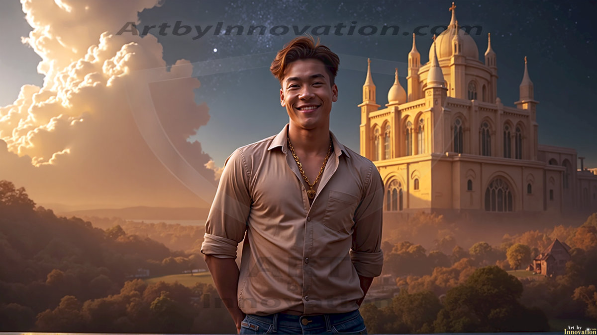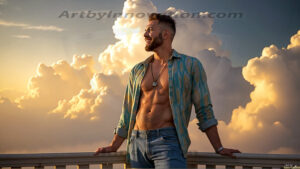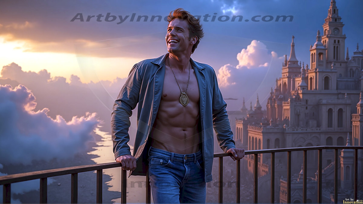 ByjeffThe Beautiful Young Men of the Golden City, is a collection of AI generated images of sexy, glamorous, handsome guys in the heavens. In this fantasy photograph of a young men in their 20’s, on a balcony, overlooking a large golden city in the heavens. Generated to be as realistic as possible, in this this fantasy setting, with todays technology. Wearing jeans, an unbuttoned, vibrant, long-sleeve, button down shirt. The subject is enjoying a beautiful day outdoors. The mystical, galactic landscape, and the vibrant cosmic canopies, every detail, from the texture of the clouds, to the magnificent, majestic gothic architecture of the golden city, is crafted to create an atmosphere of reverence and divine glory. With a breathtaking scene of Salar de Uyuni at sunset, offering warm golden hour lighting. The heavenly landscape evokes a sense of freedom and tranquility, that is expresses through his facial features and smile, as day turns to night. The heavenly landscape evokes a sense of mysterious black space and light, with a vast galaxy that almost covers the image, the stars and constellations sparkle bright, in dark blue sky. On occasion the earth can be seen floating in the sky.