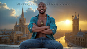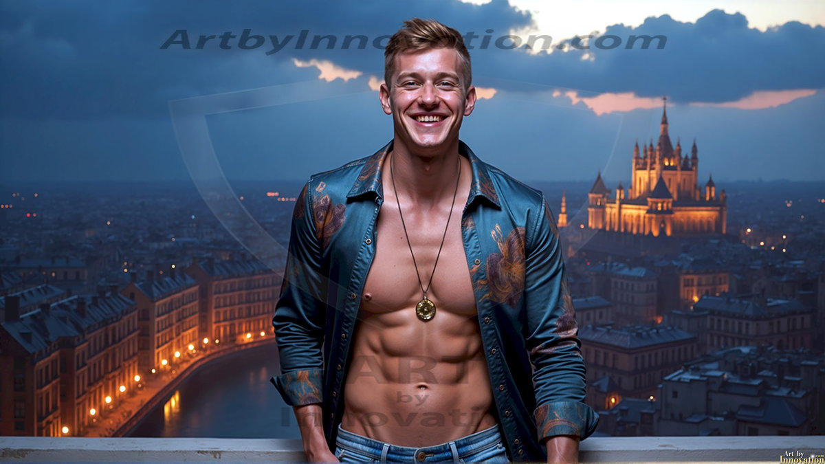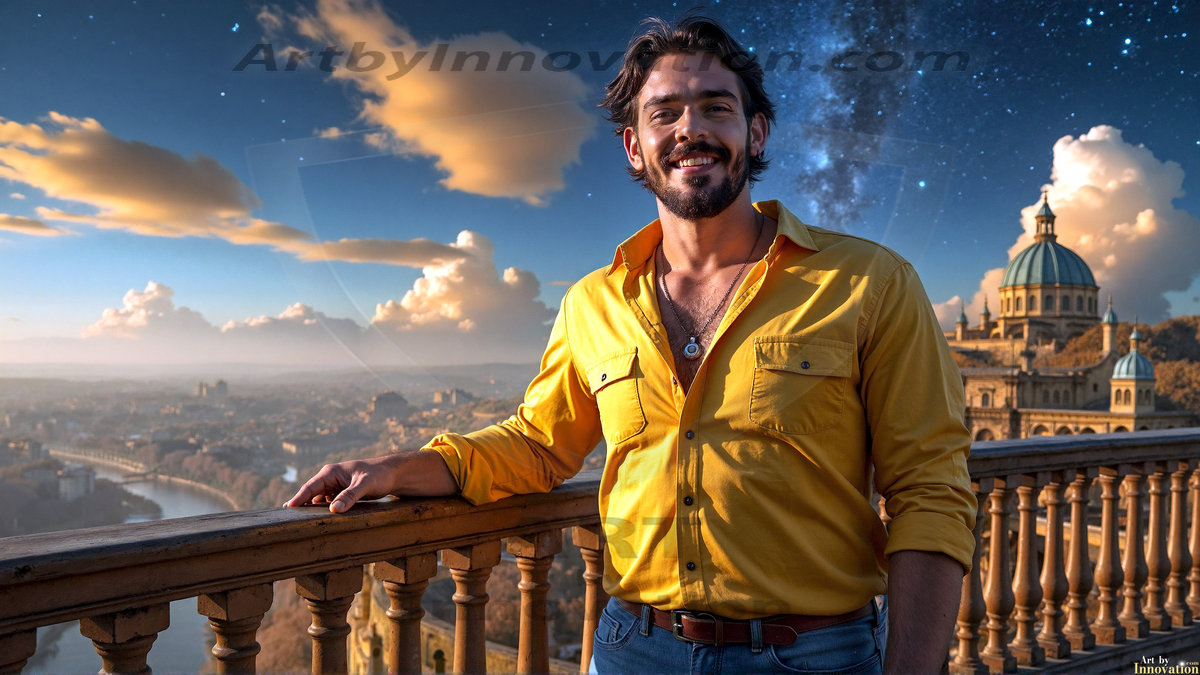 ByjeffThe Beautiful Young Men of the Golden City, is a collection of AI generated images of sexy, glamorous, handsome guys in the heavens. In this fantasy photograph of a young men in their 20’s, on a balcony, overlooking a large golden city in the heavens. Generated to be as realistic as possible, in this this fantasy setting, with todays technology. Wearing jeans, an unbuttoned, vibrant, long-sleeve, button down shirt. The subject is enjoying a beautiful day outdoors. The mystical, galactic landscape, and the vibrant cosmic canopies, every detail, from the texture of the clouds, to the magnificent, majestic gothic architecture of the golden city, is crafted to create an atmosphere of reverence and divine glory. With a breathtaking scene of Salar de Uyuni at sunset, offering warm golden hour lighting. The heavenly landscape evokes a sense of freedom and tranquility, that is expresses through his facial features and smile, as day turns to night. The heavenly landscape evokes a sense of mysterious black space and light, with a vast galaxy that almost covers the image, the stars and constellations sparkle bright, in dark blue sky. On occasion the earth can be seen floating in the sky.
