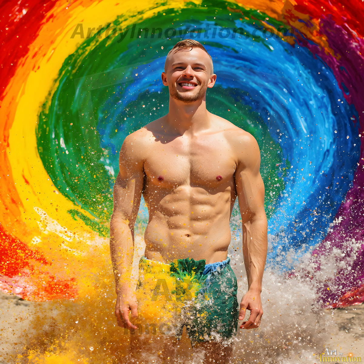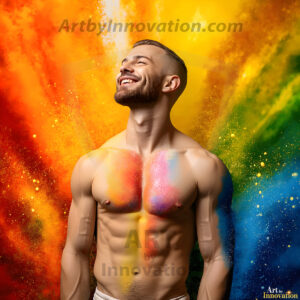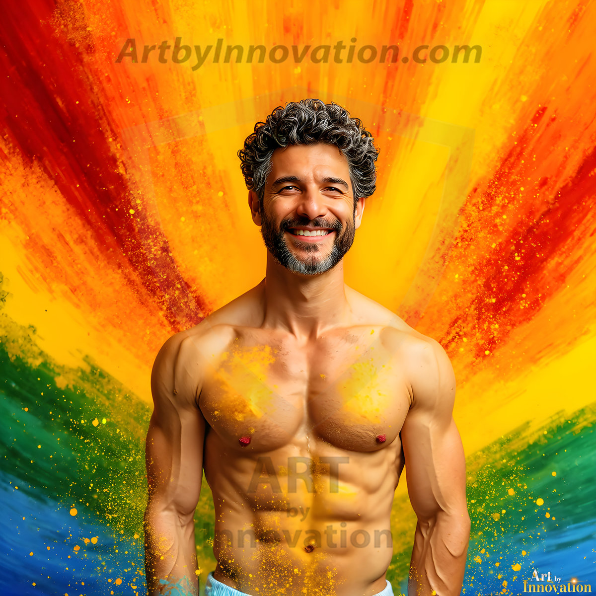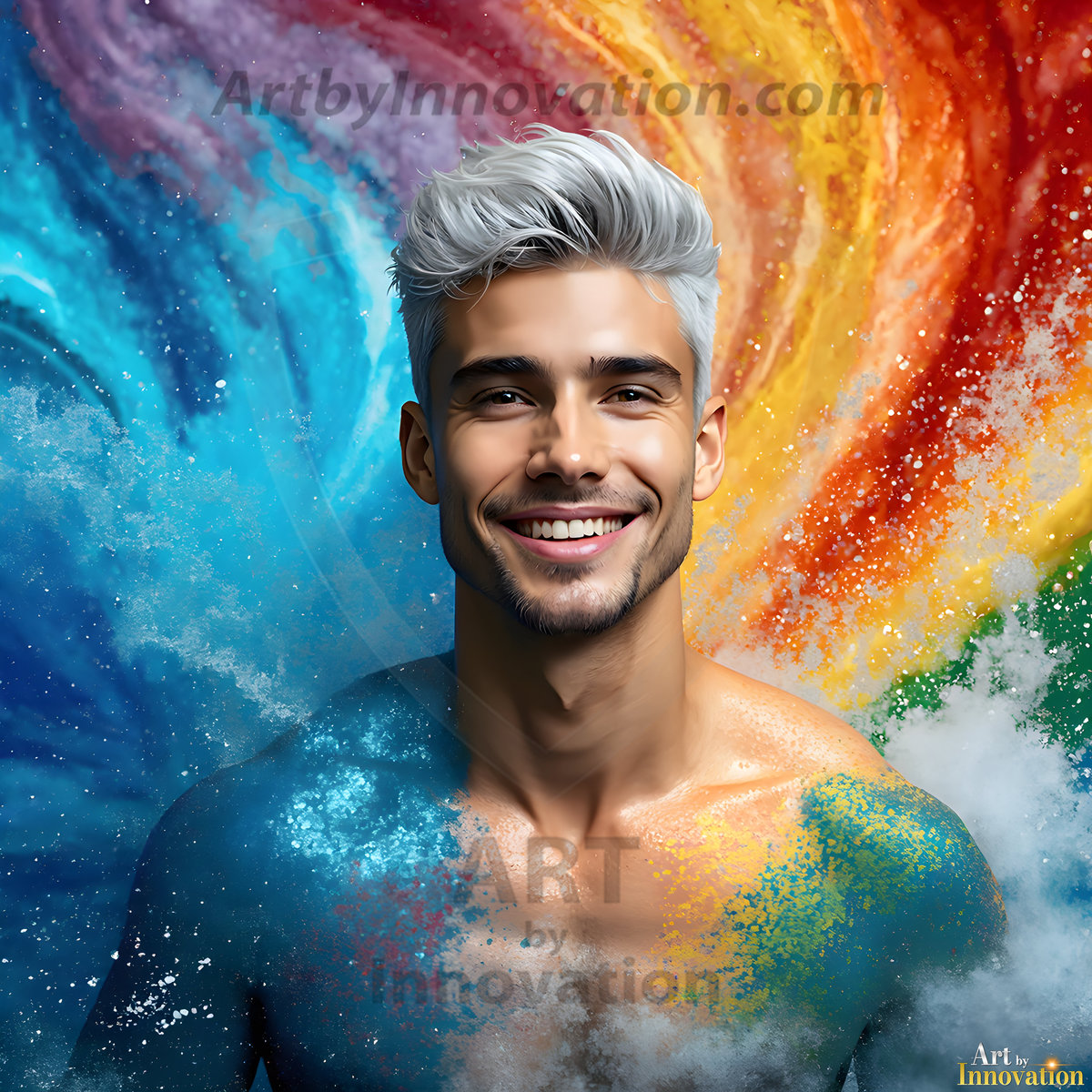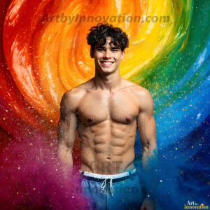 Every color tells a story. This AI-generated collection celebrates the vibrant colors of LGBTQ+ Pride — featuring beautiful, handsome men embellished with the full rainbow palette of the gay pride flag. Red for life, orange for healing, yellow for sunlight, green for nature, blue for serenity, and violet for spirit. Over 500 stunning images celebrating diversity, identity, and community. Created using Flux.1 and ComfyUI by © Jeff Dupler | Art by Innovation | https://www.artbyinnovation.com