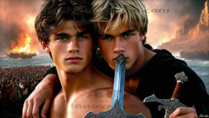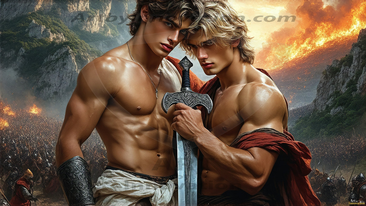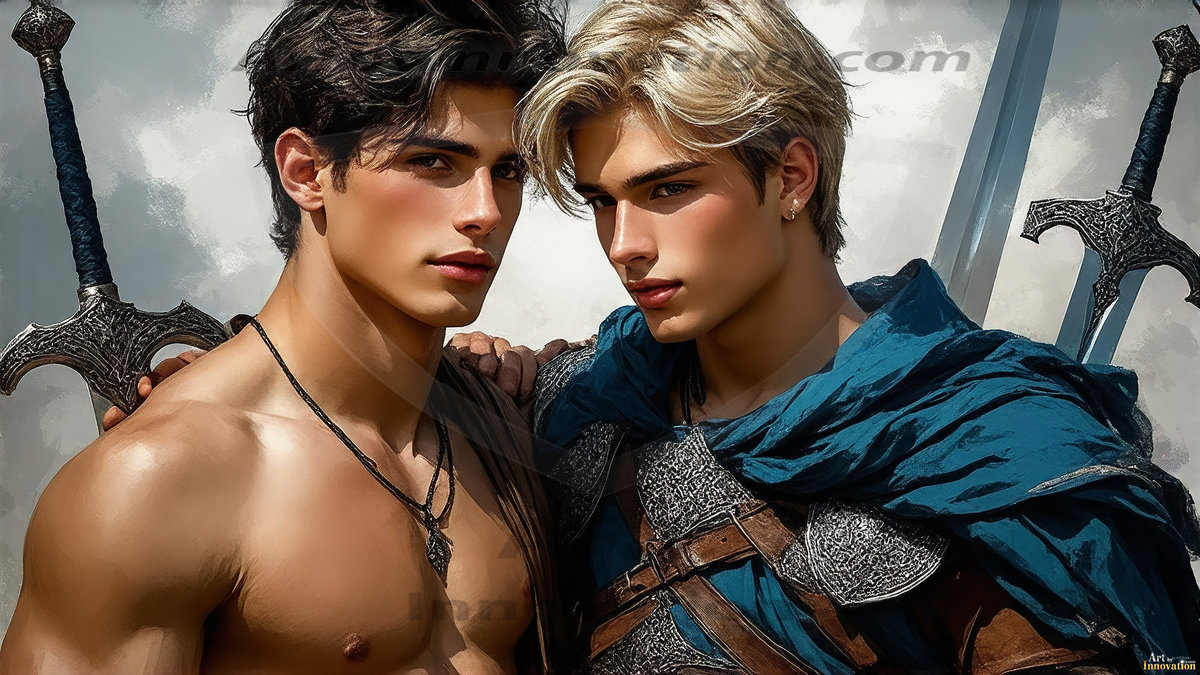 AI-generated LGBTQ Pride art — beautiful handsome men embellished with the vibrant rainbow colors of the gay pride flag. 500+ images.