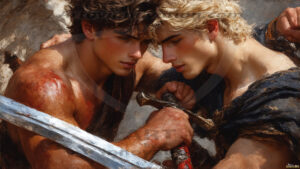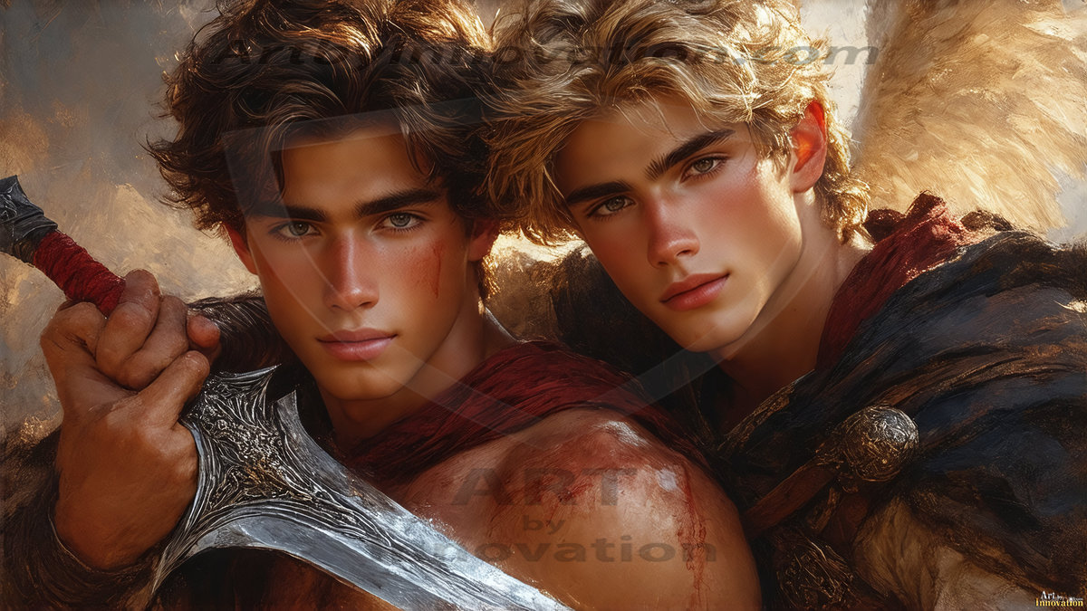 AI-generated LGBTQ Pride art — beautiful handsome men embellished with the vibrant rainbow colors of the gay pride flag. 500+ images.