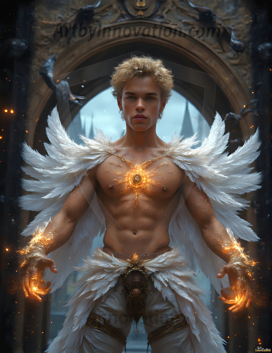 Handsome AI-generated male golden angels with enormous golden wings and radiant divine halo lighting — God’s most beautiful warriors.